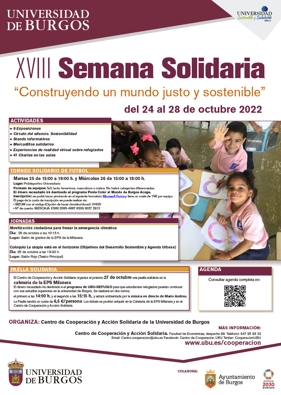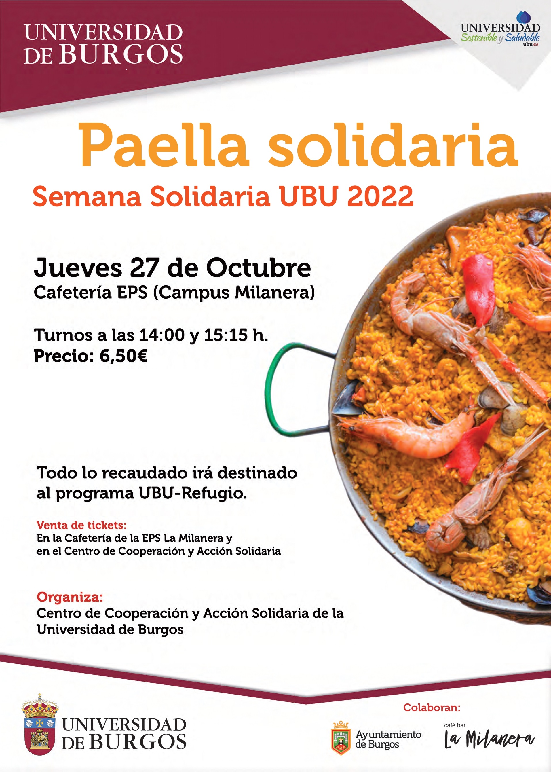El Centro de Cooperación y Acción Solidaria de la Universidad de Burgos, en colaboración con el Ayuntamiento de Burgos y la Cafetería La Milanera, organiza la Paella Solidara en el marco de la Semana Solidaria UBU 2022. Como todos los años, a lo largo de la semana del 24 al 28 de octubre se organizan diversas actividades para la sensibilización de la comunidad universitaria: exposiciones, torneo solidario de fútbol sala, charlas en las aulas, y mucho más.