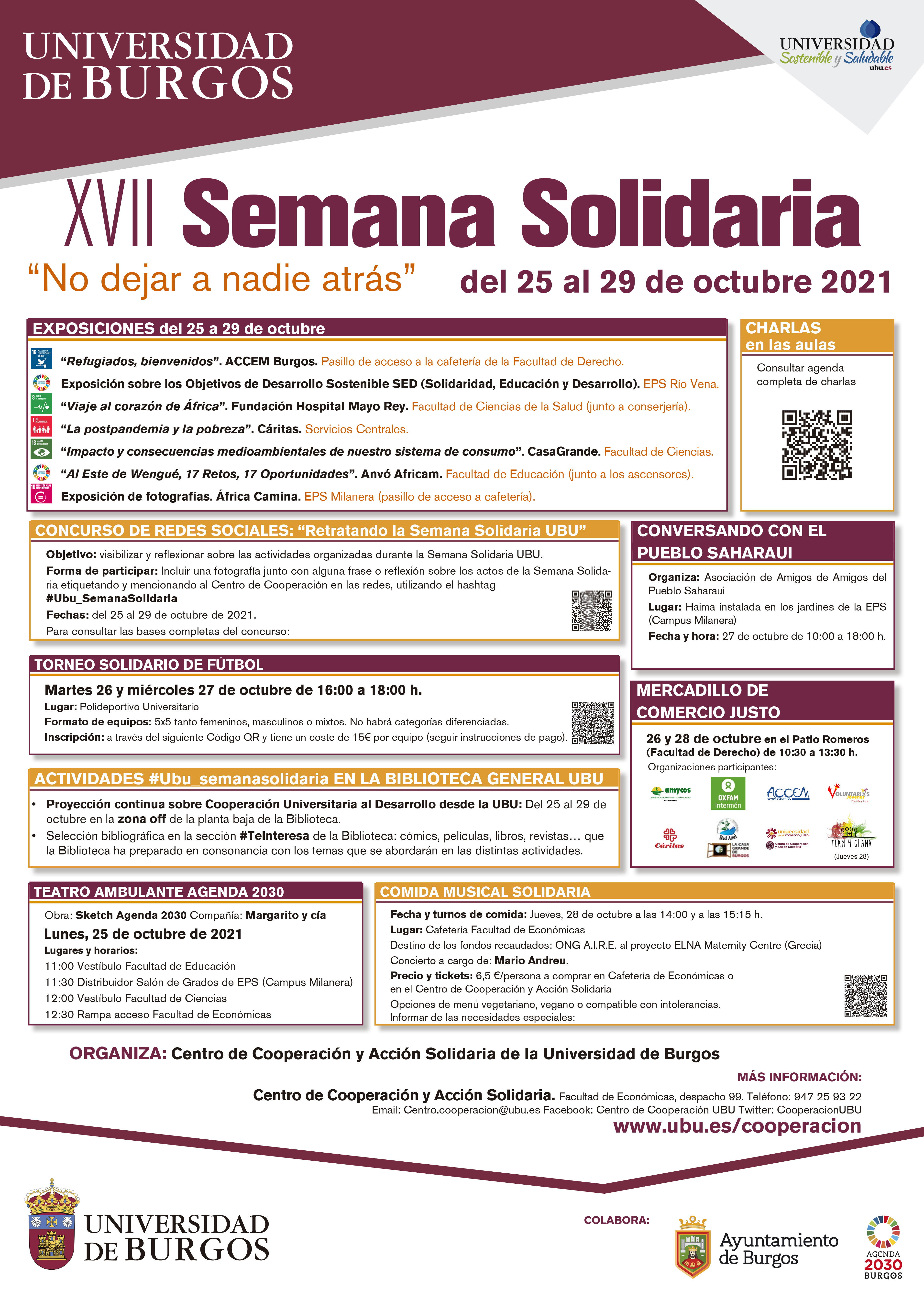 Este año, esta semana estará protagoniza bajo el lema “No dejar a nadie atrás” y para ello, contamos con 37 charlas en las aulas, 7 exposiciones, comida musical solidaria, teatro solidario, torneo de futbol sala solidario, mercadillo de productos de comercio justo, concurso en rrss 'retratando la semana solidaria' y tertulia con el pueblo saharaui. Todas estas propuestas estarán repartidas por los distintos Centros de la Universidad de Burgos a lo largo de la semana y se espera que con ellas se pueda sensibilizar a gran parte de la comunidad universitaria. Se abordarán temas como la Cooperación al Desarrollo, el Desarrollo Humano Sostenible, la Desigualdad, los Objetivos de Desarrollo Sostenible, los Derechos Humanos, la Educación para la ciudadanía, las migraciones y el refugio además de distintos proyectos y realidades de diferentes países. Para ello contamos con la participación de 21 organizaciones burgalesas, que encuentran en esta Semana Solidaria un altavoz para sus actividades y un escaparate para mostrar a la comunidad universitaria sus logros y propuestas de futuro.