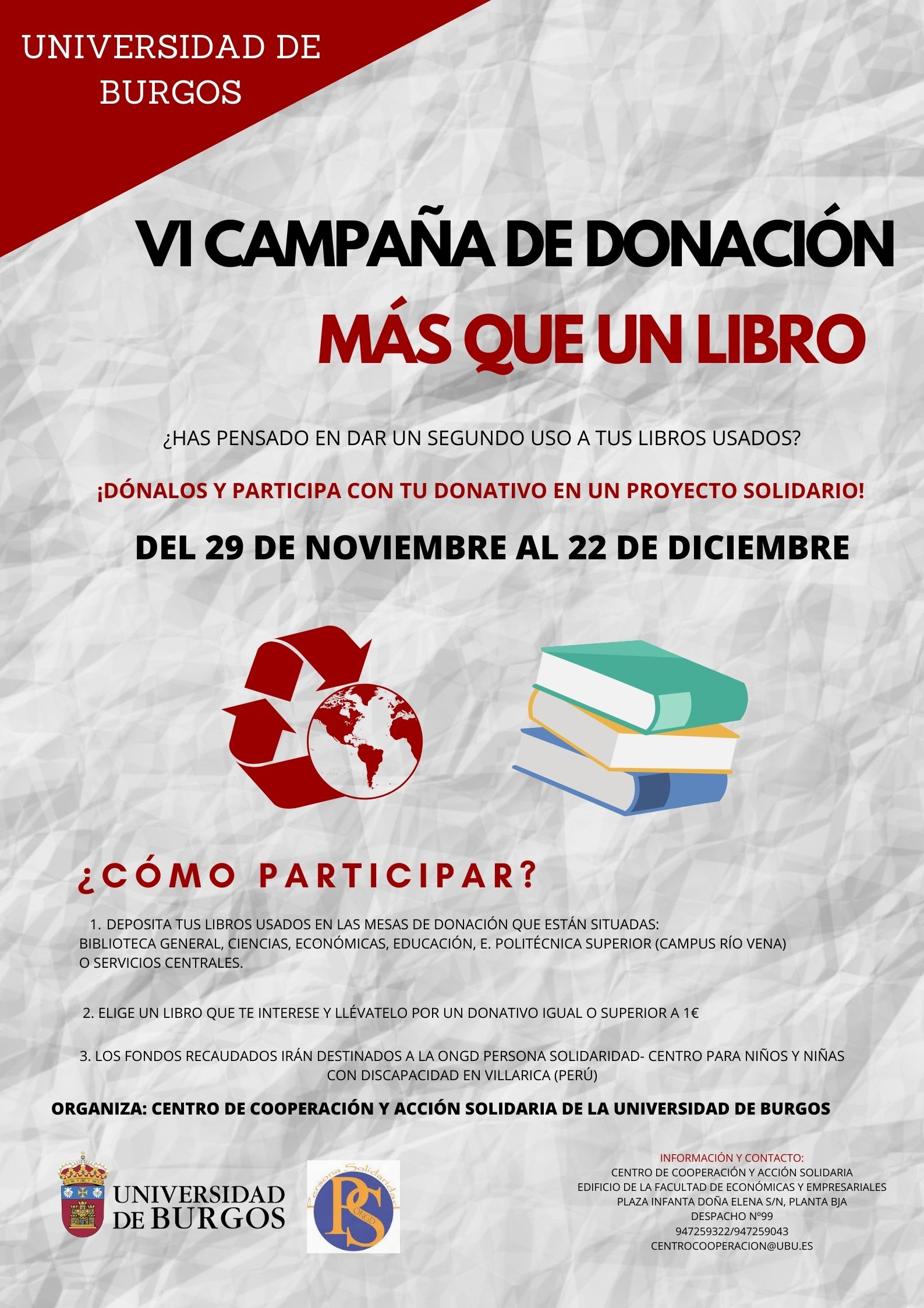 La Universidad de Burgos lleva años apostando por la sensibilización de los más jóvenes y su formación como ciudadanos críticos con la realidad que les rodea. Una de las actividades más destacadas en este sentido es la Semana Solidaria, que -con la financiación que se recibe del Ayuntamiento de Burgos- organiza el Centro de Cooperación y Acción Solidaria de la Universidad de Burgos, junto al grupo de personas que han colaborado en su preparación, mostrando su voluntad de continuar trabajando para que en la comunidad universitaria se desarrollen los valores de la solidaridad y para que la Universidad se convierta en un espacio de reflexión y debate sobre los problemas que se viven en las sociedades actuales. Las múltiples actividades que tienen cabida en la Semana Solidaria se realizan, como en ediciones anteriores, en colaboración con las ONGDs y otros movimientos sociales que trabajan en Burgos.