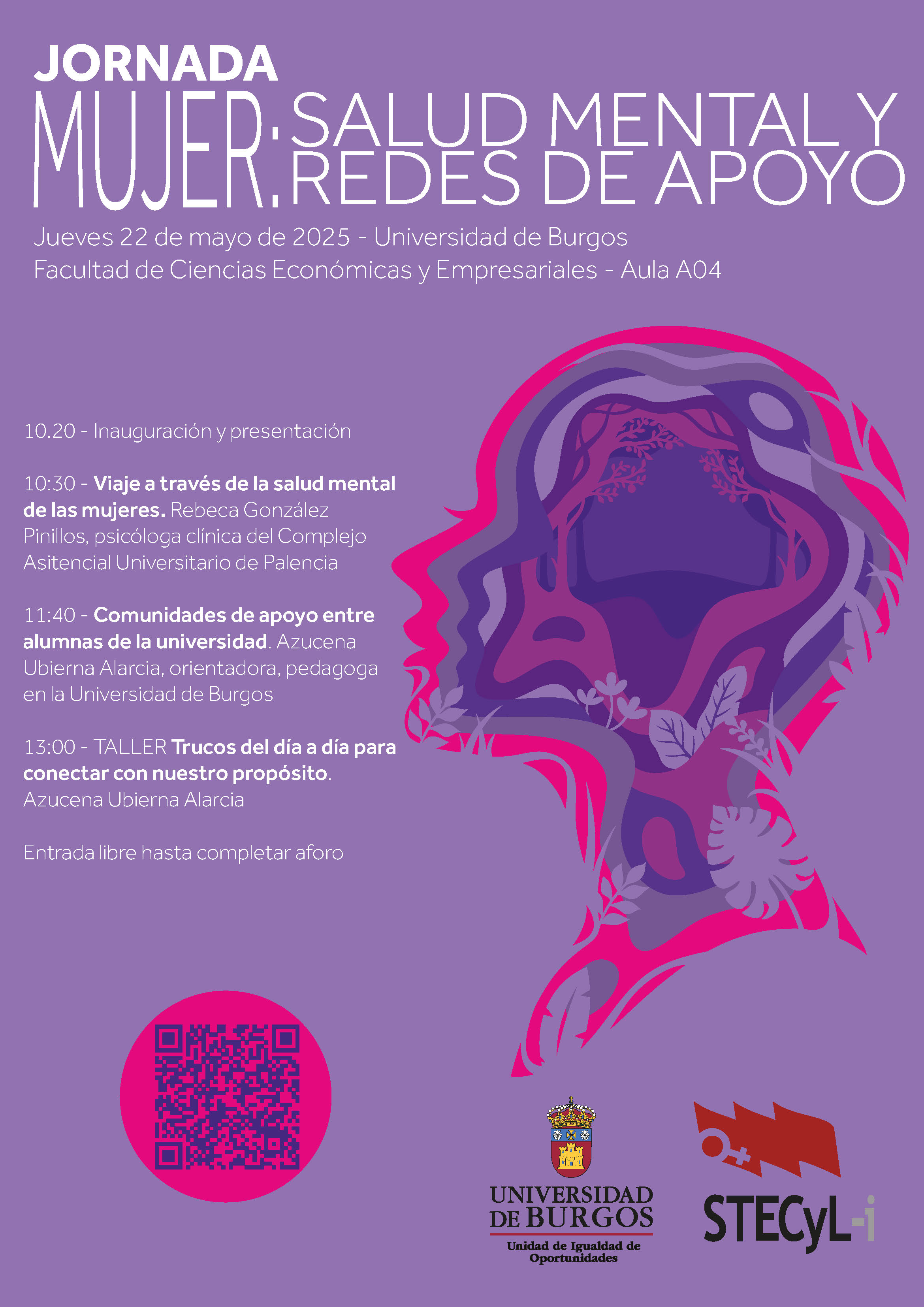 El Sindicato de Trabajadoras y Trabajadores de la Enseñanza de Castilla y León, STECYL-i, organiza, en colaboración con la Unidad de Igualdad de Oportunidades, la jornada “Mujer: salud mental y redes de apoyo” el jueves 22 de mayo en el aula A04 de la Facultad de Ciencias Económicas y Empresariales de la Universidad de Burgos.