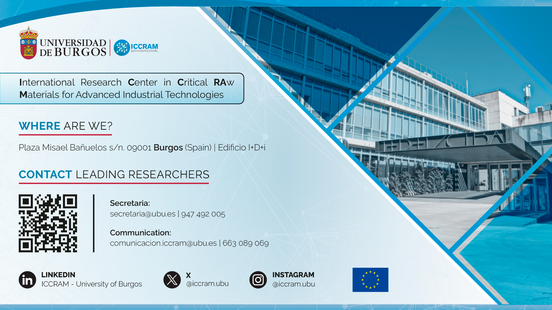 ICCRAM (International Research Center in Critical Raw Materials for Advanced Industrial Technologies) was established in 2014 as a competence Center of the University of Burgos devoted to Critical Raw Materials. Over the years, research has expanded to focus primarily on the safety and sustainability of new materials and environmental protection. In other words, making the environment we interact with as sustainable and resilient as possible, with benefits that impact both society and industry.