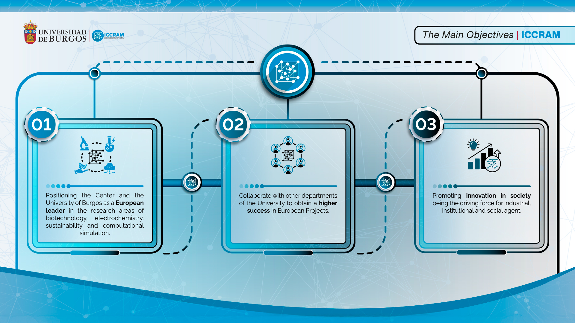 ICCRAM aims to consolidate itself as a hub of scientific excellence in key fields such as biotechnology, electrochemistry, sustainability, and computational simulation. By fostering high-impact research, generating advanced knowledge, and transferring results to industry and society, the Center seeks to place both ICCRAM and the University of Burgos at the forefront of European research. Active participation in international networks and contribution to global challenges are essential pillars of this objective.Fostering interdisciplinary collaboration within the University of Burgos
