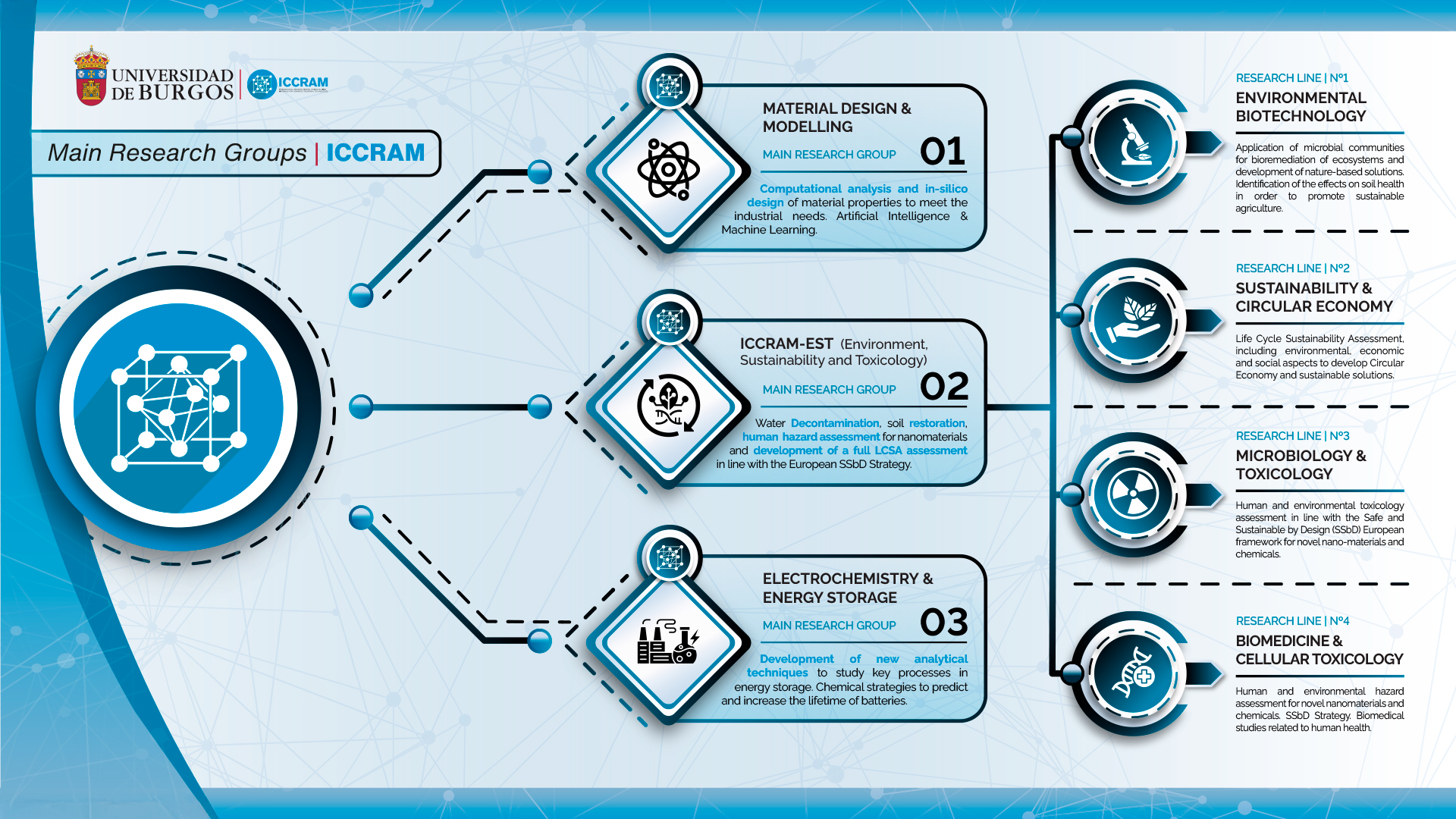 ICCRAM’s mission is to transfer scientific knowledge to the productive sector and institutions, contributing to the development of innovative solutions that address today’s challenges in sustainability, technology, and quality of life. In this sense, the Center plays a key role as a catalyst, bridging academic research with the needs of industry, public bodies, and society at large. Its goal is to foster responsible innovation and support the transition towards a more sustainable and competitive future.Accessible version of ICCRAM's introductory infographic (1.82 MB)