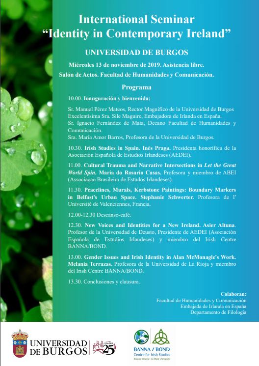 International Seminar "Identity in Contemporary Ireland" Miércoles 13 de noviembre de 2019. Asistencia libre. Salón de Actos. Facultad de Humanidades y Comunicación. Información relacionada Cartel Última actualización: 3 de Febrero de 2020