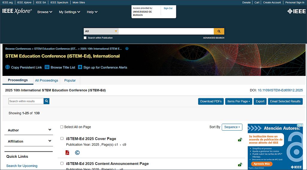 En IEEE Electronic Library (IEL) Conference Proceedings ya está disponible el texto completo de las Actas de la 2025 10th International STEM Education Conference (iSTEM-Ed), celebrada en Pattaya (Thailandia) del 30 de julio al 1 de agosto de 2025.