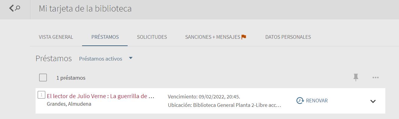 Desde "Mis préstamos" podrá ver los documentos que tenga prestados y podrá renovarlos en función de la política de renovaciones de la Biblioteca: