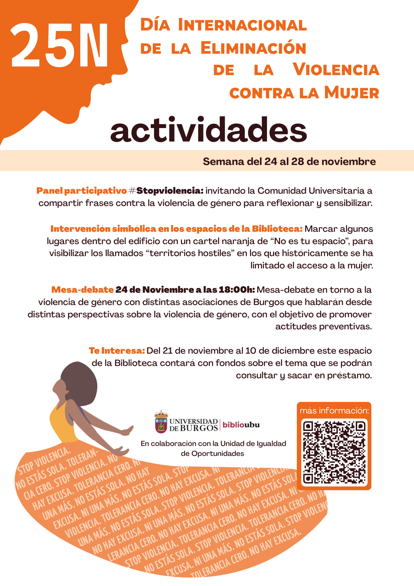 Con motivo del 25N-Día Internacional de la Eliminación de la Violencia contra la Mujer, durante la semana del 24 al 28 de noviembre la Biblioteca Universitaria Federico Sanz va a realizar las siguientes actividades: