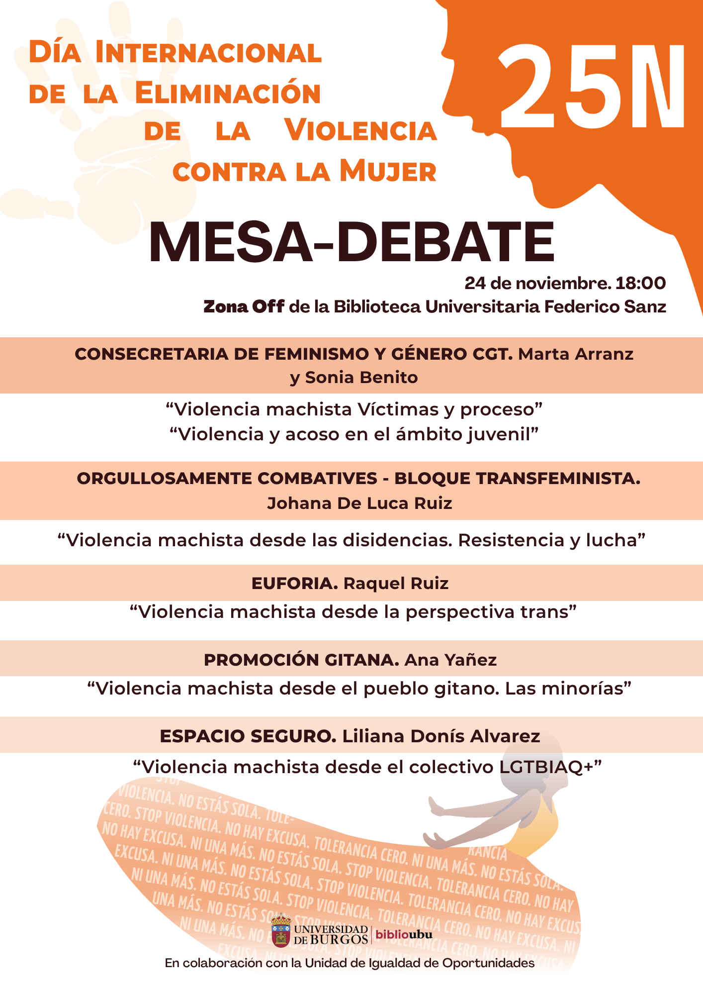 - Mesa-debate 24 de Noviembre a las 18:00h.: mesa-debate en torno a la violencia de género con distintas asociaciones de Burgos que hablaran desde distintas perspectivas sobre la violencia de género, con el objetivo de promover actitudes preventivas. Participan es esta mesa: