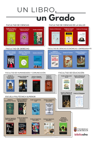 En 2025 la Biblioteca, con idea de promocionar las titulaciones que ofrece la Universidad de Burgos y fomentar el hábito de lectura, inicia un nuevo proyecto al que hemos llamado “Un Libro, un Grado”