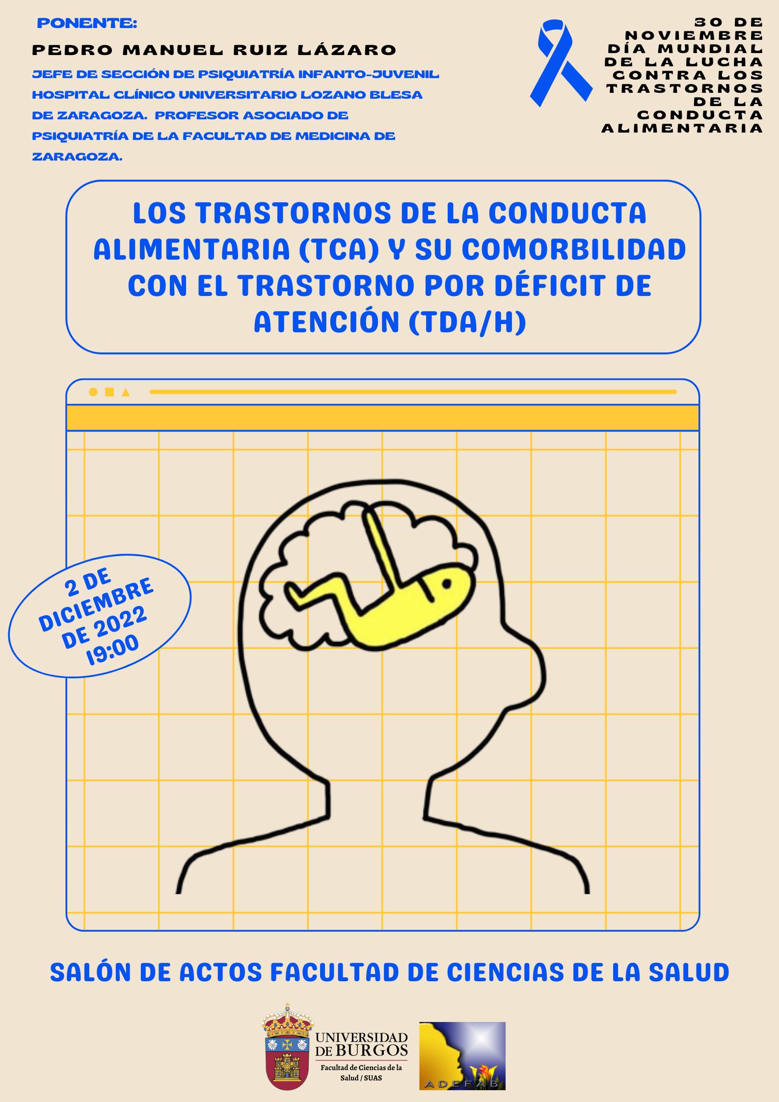 La Facultad de Ciencias de la Salud en colaboración con el Servicio Universitario de Atención a la Salud (SUAS-UBU), y la Asociación de Familiares de Personas con Anorexia y Bulimia de Burgos (ADEFAB) organizan, el 2 de diciembre, una conferencia en la que se analiza la conexión entre TCA y TDAH, enmarcada la celebración del día Mundial de la Lucha contra los Trastornos de la Conducta Alimentaria el 30 de noviembre.
