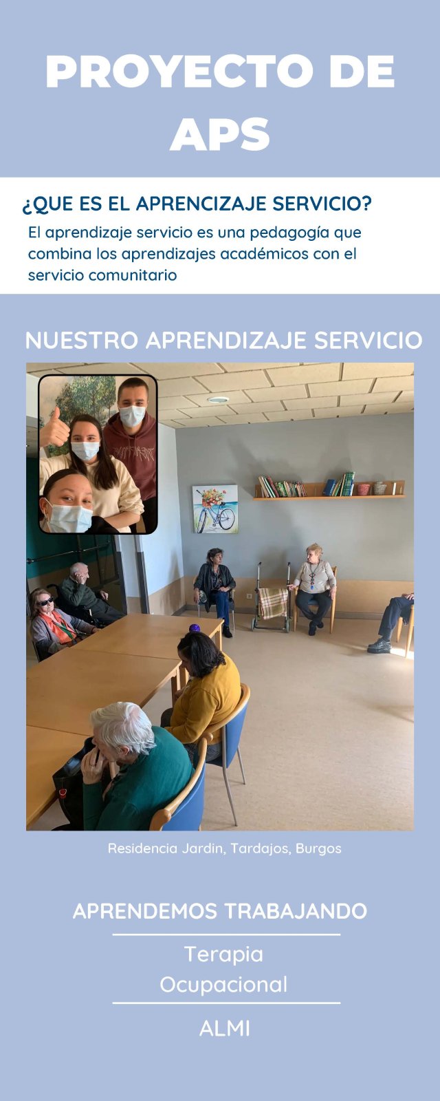 En este contexto, estudiantes han acudido a residencias para personas mayores de Burgos y provincia donde han aprendido diferentes competencias básicas o específicas, como son el trabajo en equipo, las habilidades en las relaciones personales, el compromiso ético, el razonamiento crítico y contenidos propios de la Terapia Ocupacional.