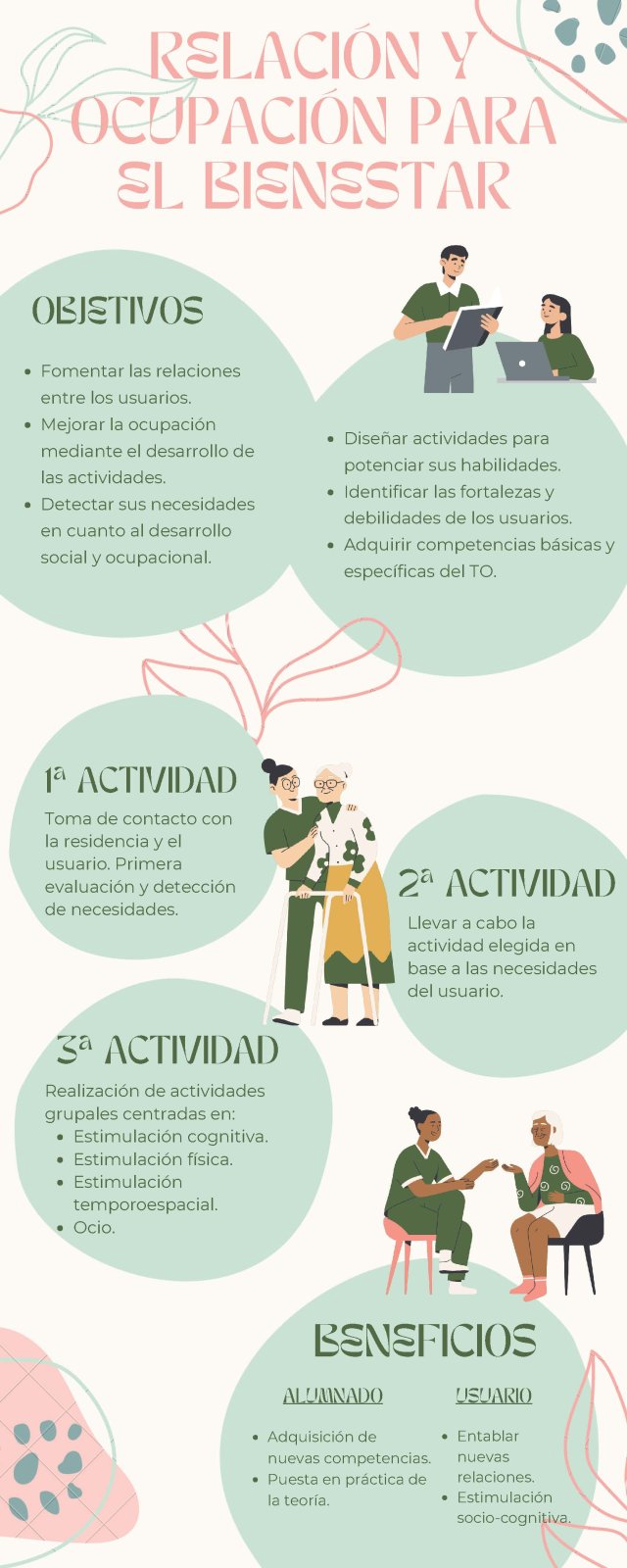 Alumnado del primer curso del Grado en Terapia Ocupacional, dentro de la asignatura “Recursos y Herramientas de la Terapia Ocupacional” que imparte la profesora María Yolanda González Alonso, ha llevado a cabo el proyecto de Aprendizaje Servicio Relación y Ocupación para el bienestar.