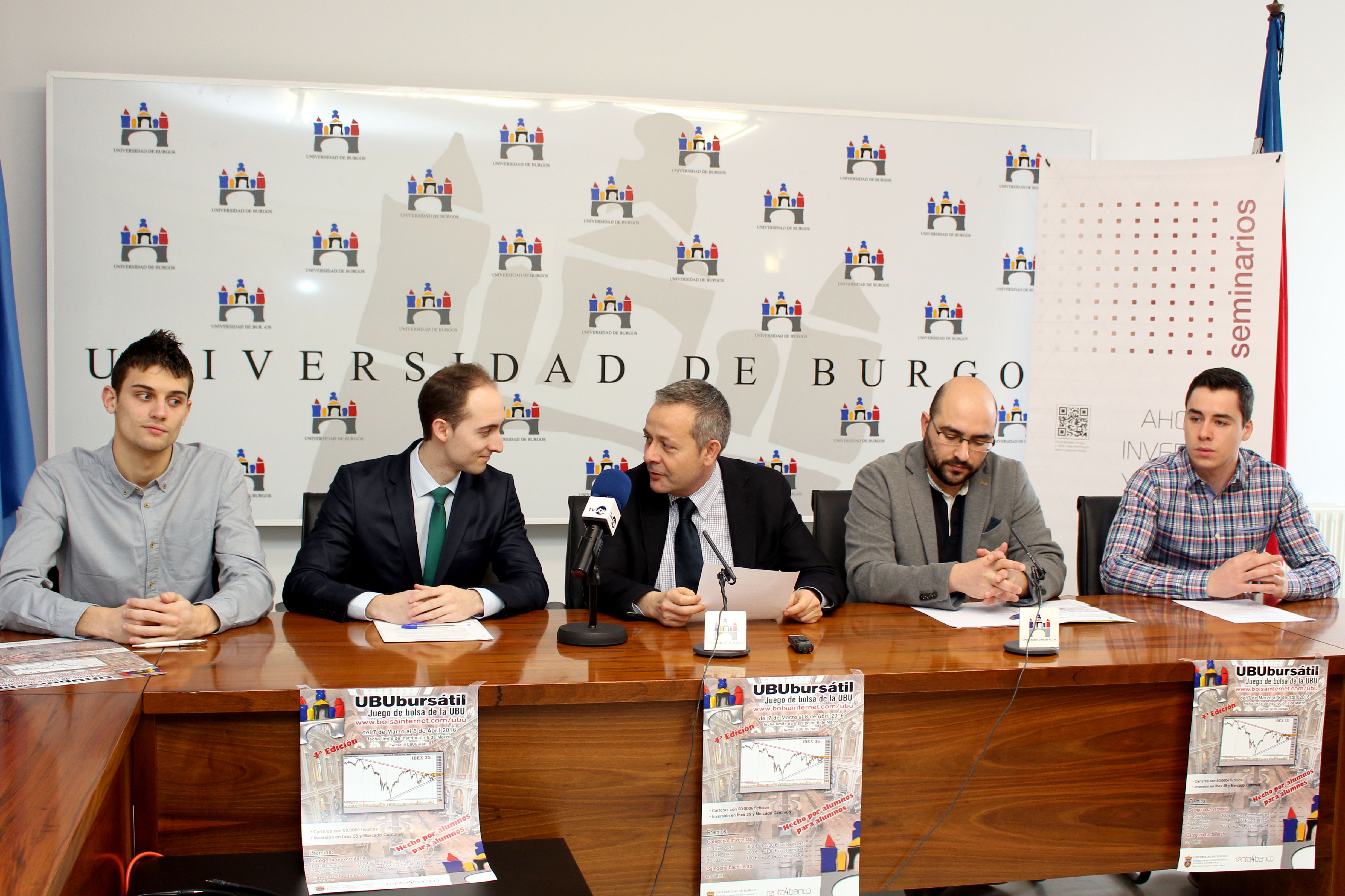 Presentación de UBUbúrsatilEl vicerrector de Estudiantes y Extensión Universitaria, René J. Payo, acompañado del asesor financiero de Renta 4, Omar Morales, de dos alumnos de cuarto de ADE, Guillermo Poza y Abel Mata, y del profesor  del grupo Docente Nexo, David Blanco, presentaron la cuarta edición del concurso que se llevará a cabo del 7 de marzo al 8 de abril