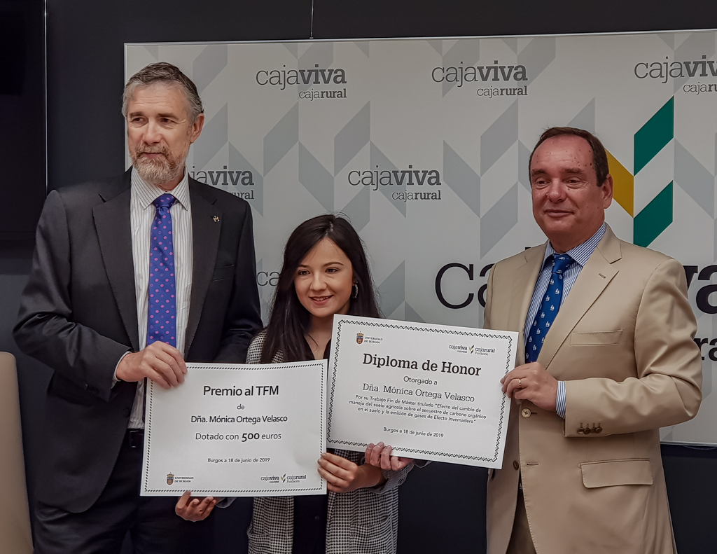 Este compromiso se ha plasmado tras el acto de entrega del premio al Mejor Trabajo Fin de Máster o Fin de Grado en estos estudios del curso 2018-2019 que han entregado el Rector Manuel Pérez Mateos y el director general de Cajaviva Caja Rural, Ramón Sobremonte que ha recaído en la estudiante Mónica Ortega Velasco dotado con 500 euros por su TFM 'Efecto