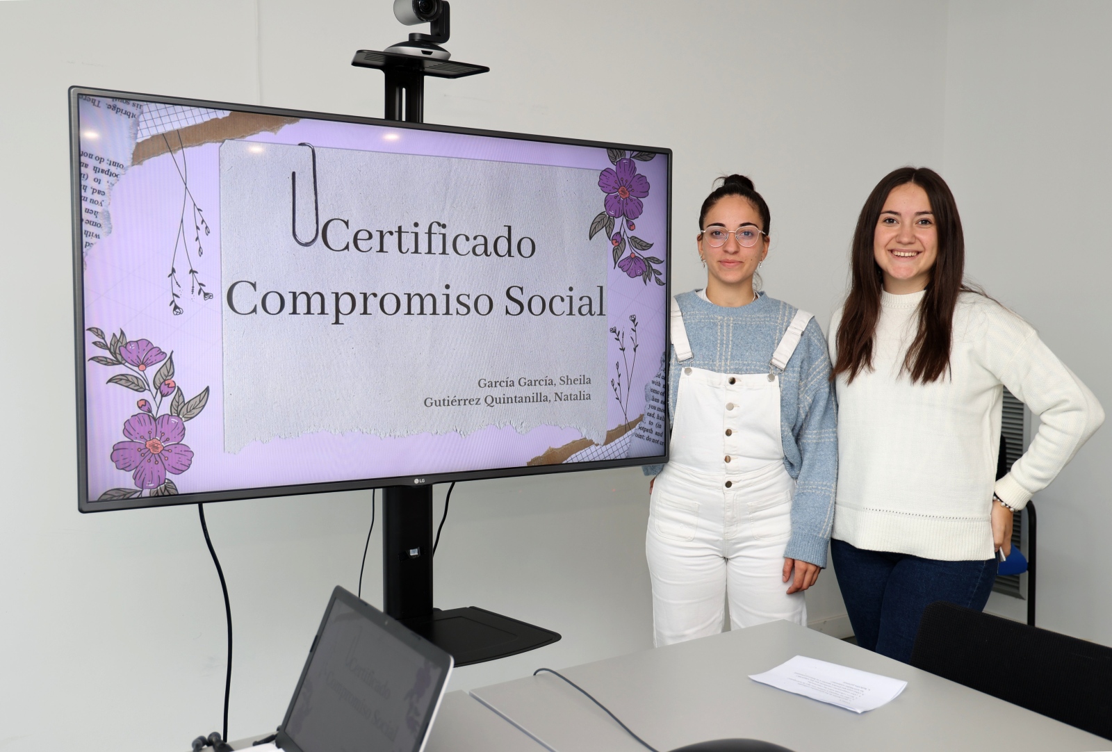 Sheila García García y Natalia Gutiérrez Quintanilla, alumnas de cuarto curso del Grado en Terapia Ocupacional, se han convertido en las primeras alumnas en obtener el Certificado al Compromiso Social (C.C.S.) tras presentar su informe final ante la comisión encargada de aprobar esta distinción. El CCS, es un documento de reconocimiento de méritos del estudiantado de la UBU que participa en actividades de carácter social y medioambiental.