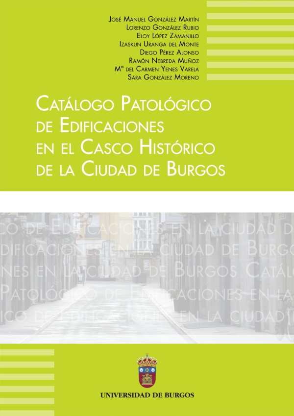 "Catálogo Patológico de edificaciones en el casco urbano de la Ciudad de Burgos" de los autores José Manuel González Martín, Lorenzo González Rubio, Eloy López Zamanillo, Izaskun Uranga del Monte, Diego Pérez Alonso, Ramón Nebreda Muñoz, Mª del Carmen Yenes Varela y Sara González Moreno, es una obra novedosa que aborda de forma gráfica las lesiones observadas en más de 300 edificaciones del casco histórico de Burgos, con un intenso trabajo de campo para elaborar fichas que incorporan los datos estadísticos y constructivos de cada edificio estudiado, analizando sus posibles causas y planteando las soluciones más viables a las mismas.