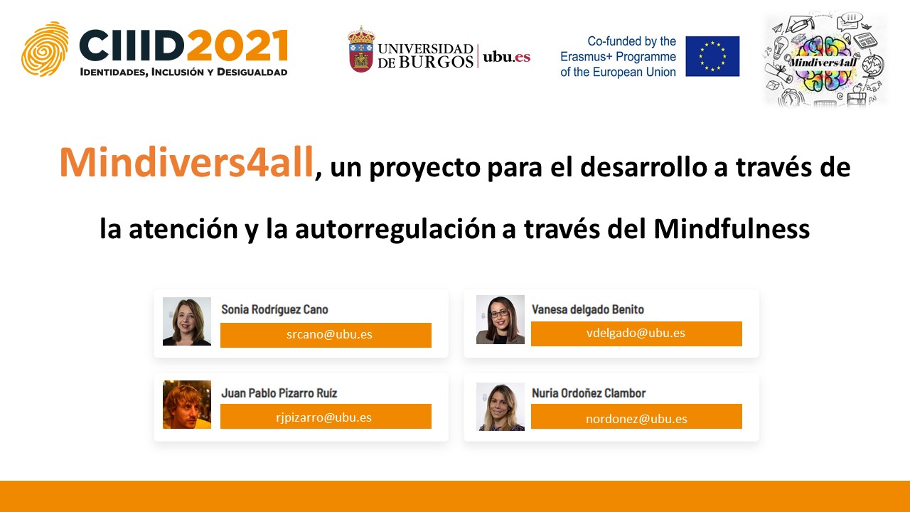 El proyecto europeo Erasmus+ MINDIVERS4ALL (Development of a care program based on the principles of Mindfulness and holistic) coordinado por el Colegio Aurelio Gómez Escolar de la ciudad de Burgos, junto con la Universidad de Burgos, el IES Teguise en Lanzarote, ONG Voluntariado en Barcelona, un socio en Turquía (Izmit Bilim ve Sanat Merkezi) y otro en Malta (St.Clare College, San Miguel Primary Education Resource Centre), participó los días 21 y 21 de mayo en el "I Congreso Internacional Identidades, Inclusión y Desigualdad. Diálogos pluridisciplinares". Este proyecto propone el desarrollo de un programa de atención basado en los principios del Mindfulness.