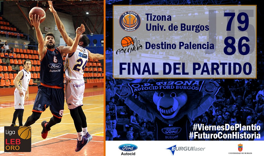 El Tizona Universidad de Burgos no pudo culminar con victoria su duelo regional ante el Destino Palencia al caer derrotado por 79 a 86. El derbi se desarrolló en todo momento de forma muy igualada. Tras un primer cuarto de mucha anotación, las defensas se impusieron en el siguiente periodod. Ninguno de los equipos daba su brazo a torcer y la ventaja momentánea lograda por los visitantes nunca fue superior a los seis puntos. Liderados por su acierto exterior y la presencia reboteadora de Rawson, los burgaleses tomaron el mando del encuentro en el periodo decisivo. Cuando mejor se encontraba el Tizona, una falta antideportiva en contra de sus intereses pasó factura a los locales en el momento decisivo del choque y los alejó del ansiado triunfo.