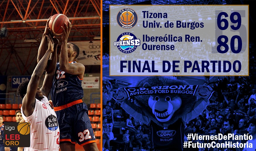 cancha, aportando en el rebote y la anotación. La reanudación de los gallegos no fue la mejor y el Tizona lo aprovechó para cerrar un parcial de 12-2 gracias a un nuevo triple de Galarreta (54-70). El equipo burgalés afrontaba su mejor momento en el encuentro y se metió en el partido gracias a dos triples consecutivos de Iván Martínez y Rawson (60-73). El Tizona creía en sus opciones y redujo la desventaja a solo nueve puntos por medio del propio ala-pívot norteamericano. Sin embargo, el Ourense reacción y anotó por partida doble para impedir la remontada azulona. Los burgaleses lo intentaron en la recta final del partido, pero no pudieron culminar la remontada y la victoria cayó del lado visitante. El mejor de los locales fue finalmente Tyler Rawson, que sumó 17 puntos, 8 rebotes y 18 créditos de valoración. El próximo fin de semana los azulones afrontarán un corto desplazamiento para medirse al Destino Palencia en la sexta jornada de la LEB Oro.