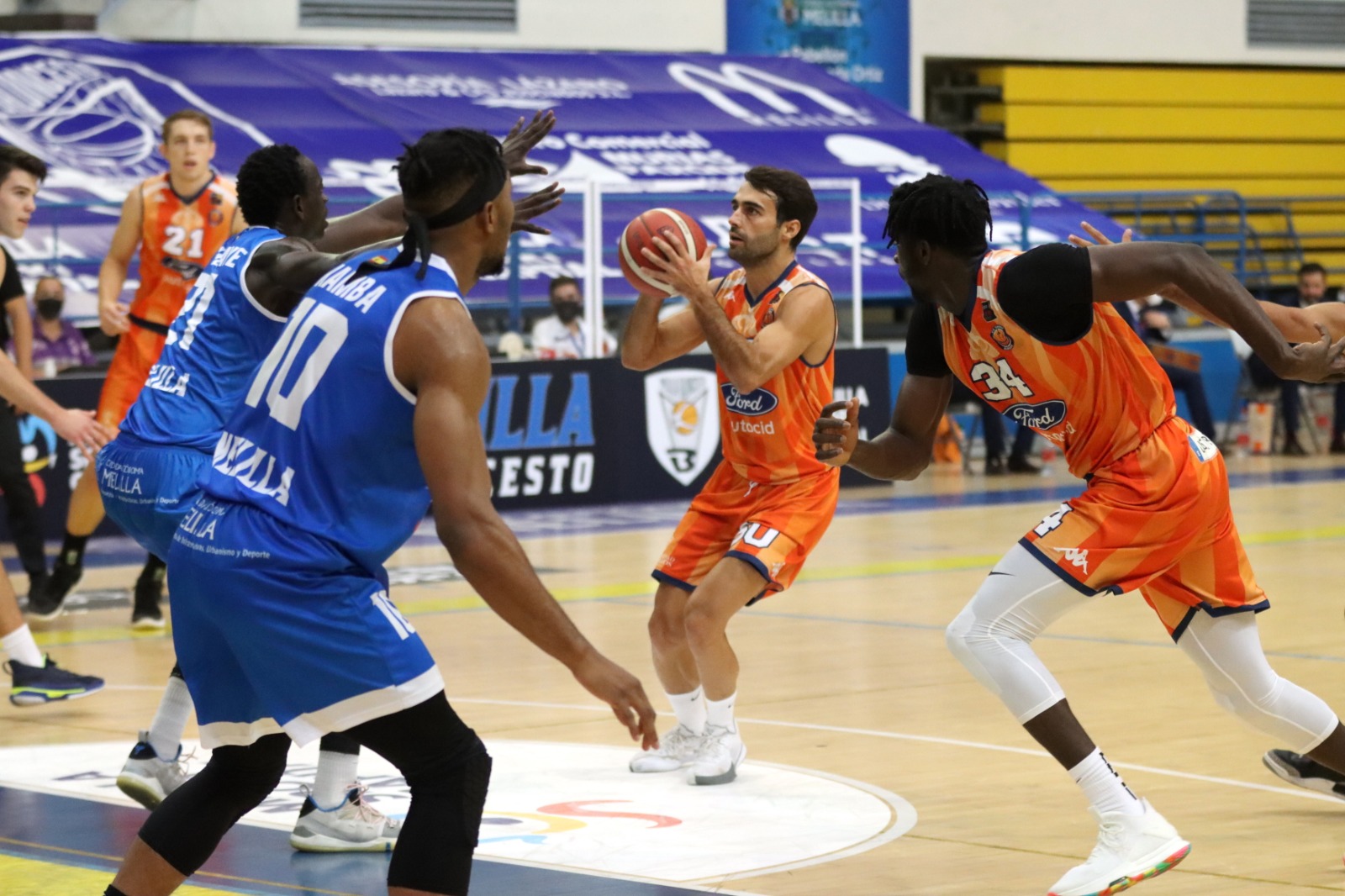 Los burgaleses continuaron apostando por el juego exterior y lograron un nuevo triple de las manos de Úriz. El Tizona mantuvo un ritmo alto de choque en los minutos posteriores, pese a contar con un rodaje competitivo menor que el de su rival. Tras una canasta en transición de Kody, los titulares del equipo que hoy vestía de naranja volvieron a cancha. La muñeca de los de Jorge Elorduy seguía estando bien engrasada y Rawson repetía desde el perímetro (35-41). Antes del descanso, el Melilla logró reducir la distancia gracias a varios tiros exteriores liberados. El canario Ayoze respondía anotando en una penetración con la que obtuvo un tiro adicional (44-46). Ambos equipos tomarían el camino de los vestuarios en un partido con una anotación muy elevada y con un 50% de efectividad desde el triple para el Tizona.