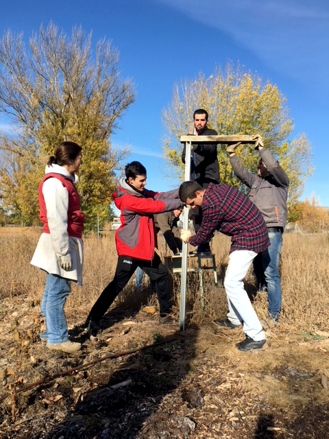 Tras la plantación de viñas en colaboración con el Consejo Regulador de la Denominación de Origen Arlanza, llevada a cabo el pasado mes de abril, los alumnos han instalado los postes para la posterior conducción de la parte aérea de la cepa.