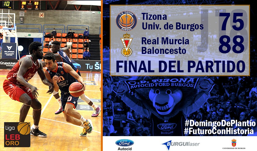 El Tizona Universidad de Burgos dijo adiós a la LEB Oro con la cabeza alta y con una sonora ovación de sus aficionados. El equipo azulón no pudo imponerse a un Real Murcia que certificaría así su permanencia, pero mostró su mejor imagen haciendo frente a las numerosas bajas con las que afrontaba el choque. Con solo ocho jugadores en dinámica de entrenamientos en la última semana debido a las lesiones y ausencias por motivos familiares de hombres importantes del grupo, los burgaleses saltaron a la cancha dispuestos a dejarse la piel por el escudo que defendían.