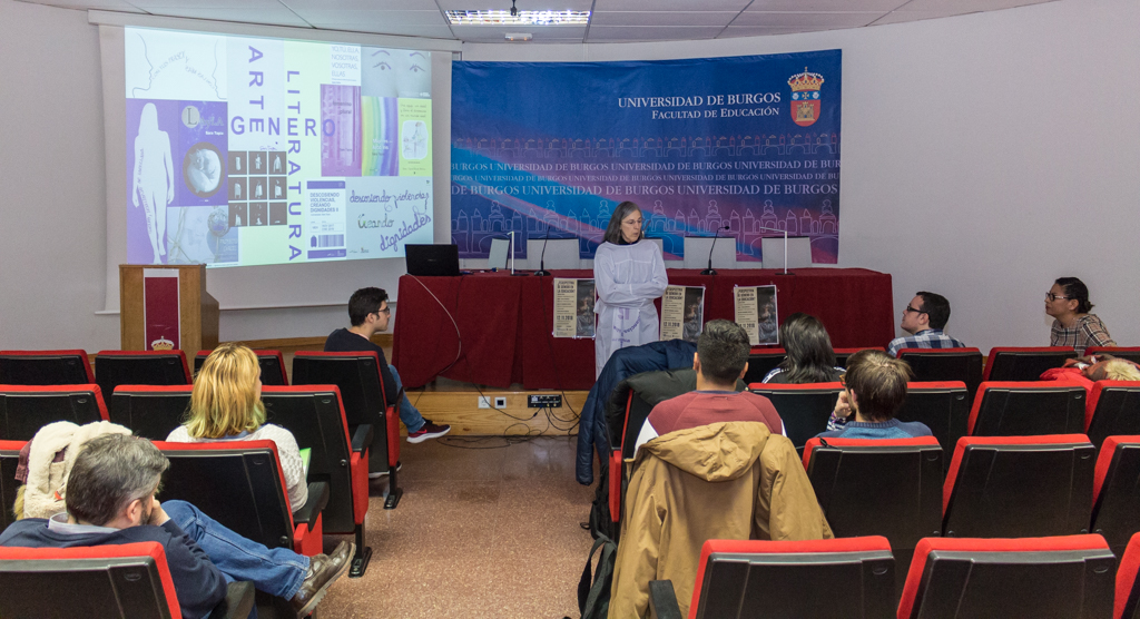 Para la profesora de la UBU, Sara Tapia “No existe perspectiva de género en la educación, hasta donde yo conozco, y con mi trabajo intento establecer conexiones entre el arte, la literatura, el género y la docencia, implicando a mis alumnos para, a través de la creación artística, fomentar la comprensión de la idea de género, sobre todo en lo que respecta a violencia e igualdad”. Para apoyar su intervención la profesora Tapia realizó una pequeña performance que explicaba la necesidad de la concurrencia de toda la ciudadanía, hombres y mujeres, para ayudar en la sensibilización con la violencia de género existente. Durante su presentación dio a conocer varios ejemplos de actividades artísticas y académicas que ha venido realizando con este objetivo en las que han participado alumnos de la asignatura de Igualdad y perspectiva de género, que imparte en el Grado en Educación Social.
