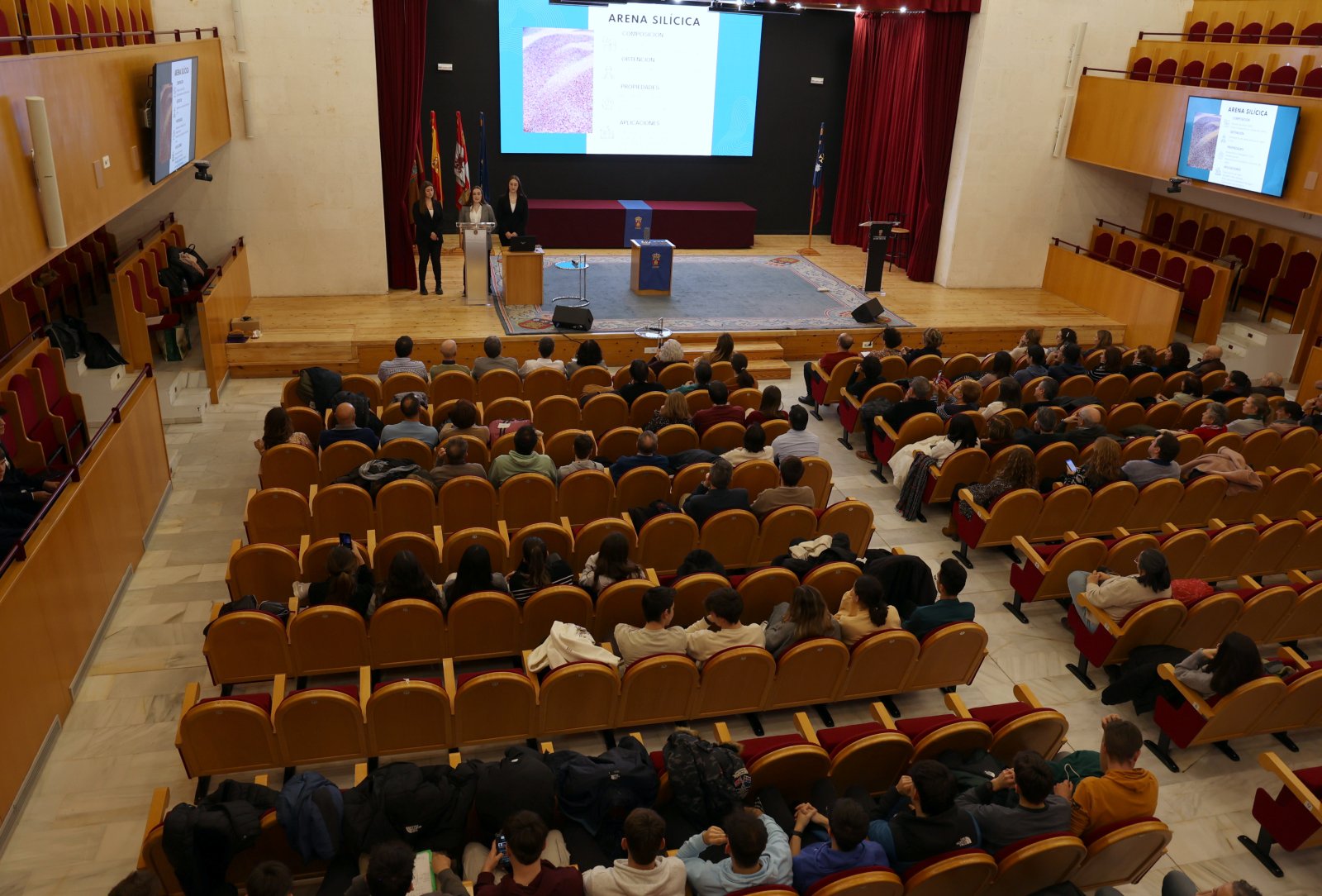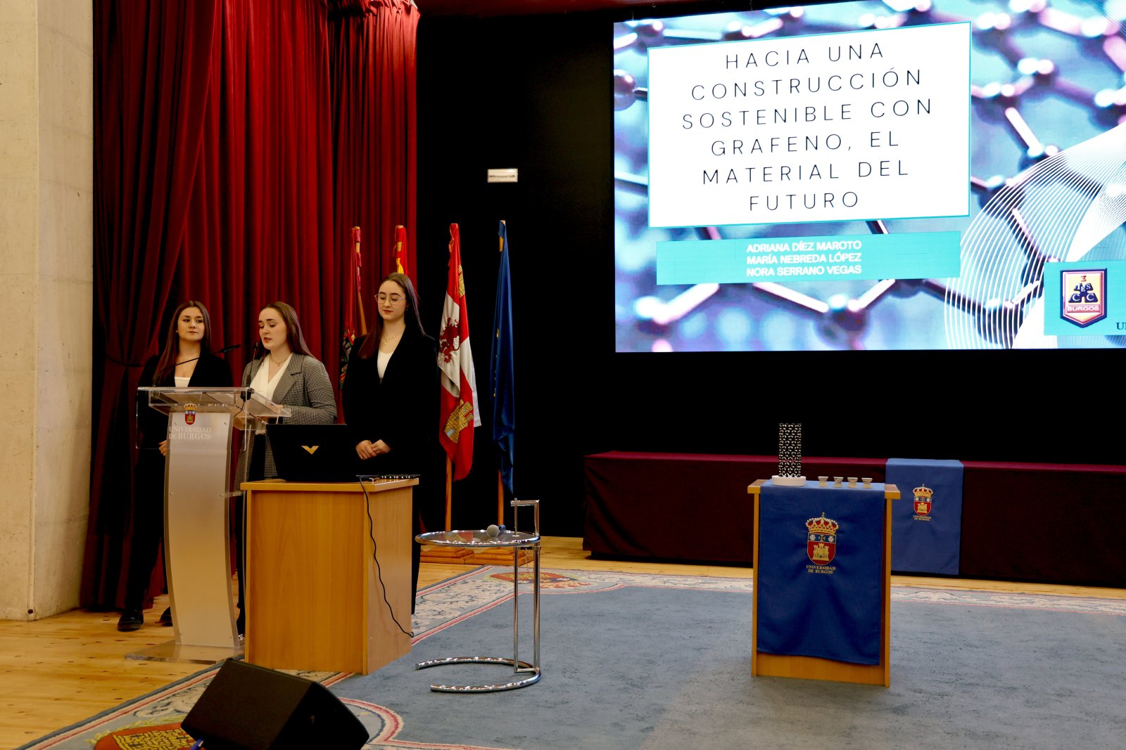Adriana Díez Maroto, María Nebreda López y Nora Serrano Vegas, fueron las primeras en exponer y defender su proyecto Hacia una construcción sostenible con grafeno, el material del futuro, tutorizado por las profesoras, del Departamento de Construcciones Arquitectónicas e Ingeniería de la Construcción y del Terreno de la Universidad, Raquel Arroyo Sanz, Lourdes Alameda Cuenca-Romero y Alba Rodrigo Bravo en estrecha colaboración con la profesora del IES Comuneros de Castilla Antonina Blanco Dueñas.