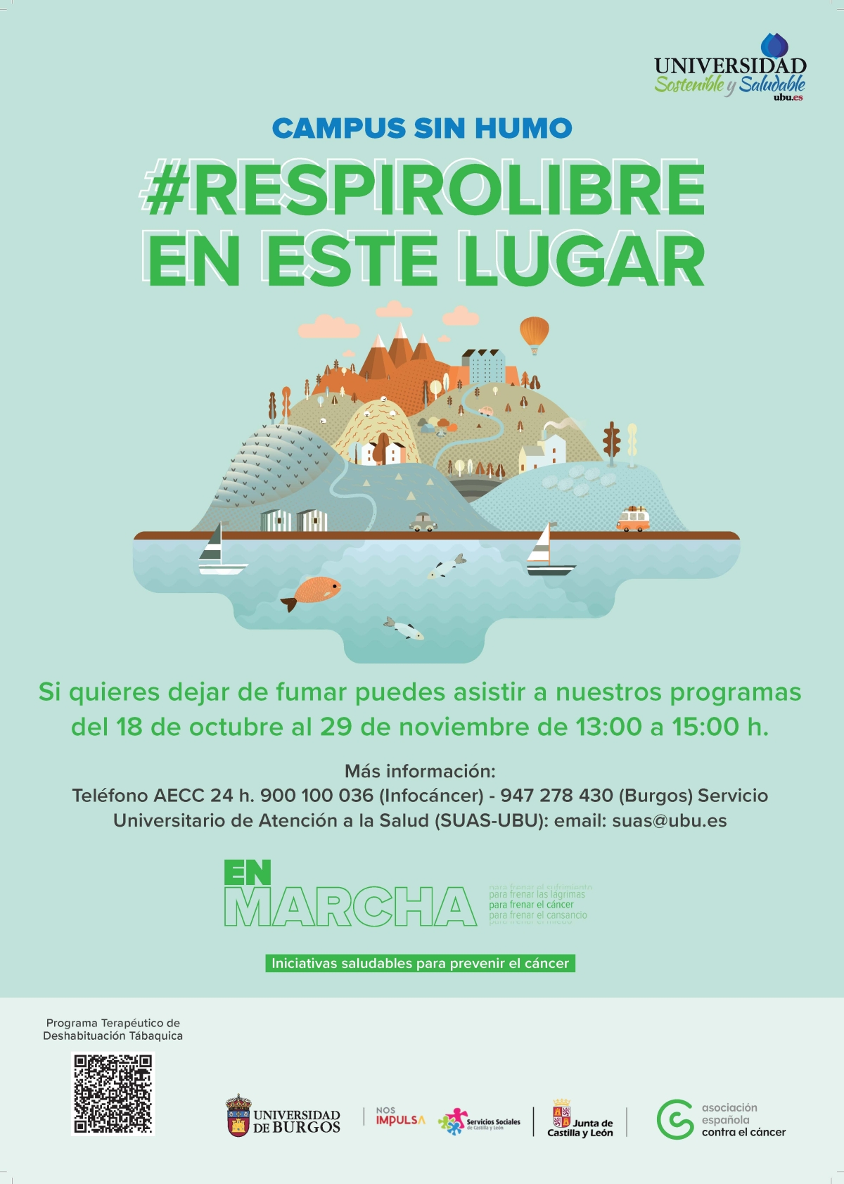 La Universidad de Burgos, con el fin de facilitar la aplicación legislativa de las medidas sanitarias frente al tabaquismo, consolidar los espacios libres de humo del tabaco y proteger la salud de todos los miembros de la Comunidad Universitaria, en colaboración con la Asociación Española Contra el Cáncer (AECC), ha diseñado un espacio de asesoramiento y tratamiento que posibilite modificar la conducta de fumar.