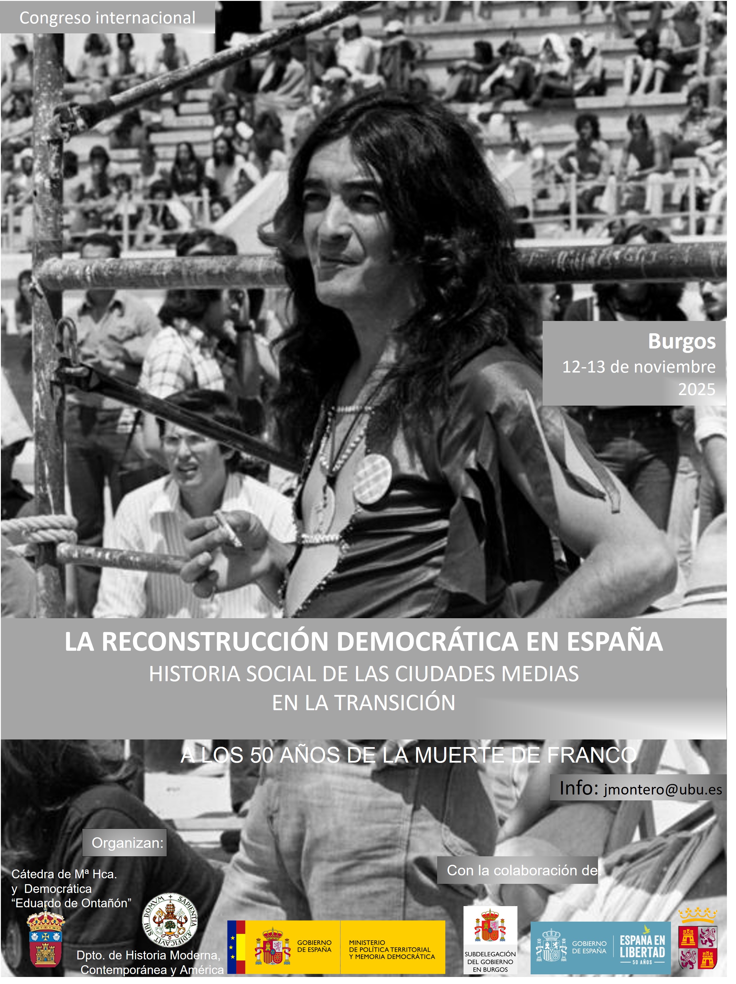 Entre ellas destaca el Congreso Internacional “La reconstrucción democrática en España. Historia social de las ciudades medias en la Transición”, organizado por la Cátedra de Memoria Histórica y Democrática Eduardo de Ontañón de la Universidad de Burgos, junto con el Departamento de Historia Moderna, Contemporánea y de América de la Universidad de Valladolid y que tendrá lugar en Burgos el 12 y 13 de noviembre. Con un enfoque interdisciplinar y articulado en cuatro ejes temáticos -municipalismo, nuevos espacios para las mujeres, legados del franquismo vs. nuevas estructuras democráticas y víctimas y Memoria Democrática-, el encuentro reunirá a especialistas de diferentes ámbitos en el Paraninfo de la Universidad de Burgos en la primera jornada y en el Salón de Actos de la Facultad de Humanidades y Comunicación durante la segunda.