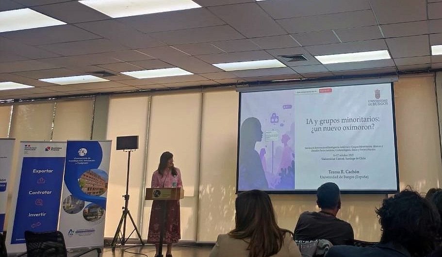 La investigadora del Área de Derecho Civil de la Universidad de Burgos, Teresa Rodríguez Cachón, participó el pasado jueves 16 de octubre en el seminario internacional ‘Inteligencia artificial y grupos minoritarios: dilemas y desafíos sociojurídicos, criminológicos y éticos’, organizado por la Universidad Central en Santiago de Chile.