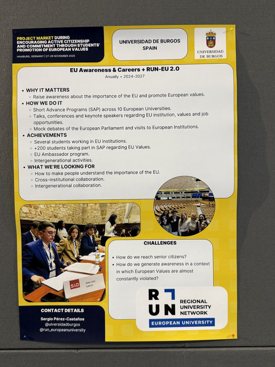 La Universidad de Burgos ha estado presente en la Training and Cooperation Activity (TCA) titulado “Encouraging Active Citizenship and Commitment through Students’ Promotion of European Values”, celebrado en Hamburgo del 27 al 29 de noviembre de 2025. Este encuentro, organizado por la Agencia Nacional Erasmus+ alemana (DAAD) con el apoyo de la Comisión Europea, reunió a representantes de instituciones de educación superior, profesorado y estudiantes para reflexionar sobre cómo promover los valores europeos y la participación activa en la sociedad.