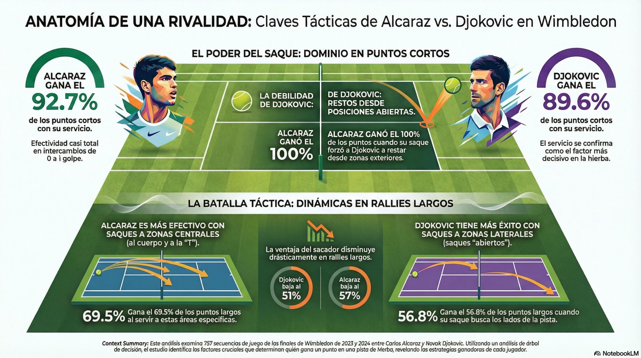 El estudio también revela diferencias interesantes entre ambos campeones. Alcaraz obtiene mejores resultados cuando dirige su saque hacia zonas más centrales, lo que le permite dominar el punto desde el inicio. Djokovic, por su parte, es más efectivo cuando abre el ángulo del servicio hacia las zonas laterales, aunque muestra mayores dificultades cuando debe restar desde posiciones muy abiertas.