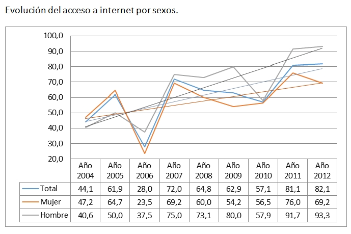 Los datos revelan que, de media, el 65,1 % de los participantes usa Internet. El acceso a Internet aumentó en un 37,9 % de media, frente al porcentaje de la presencia de ordenadores en casa, casi siete puntos inferior. Al analizar los datos por sexos, destaca que el porcentaje de mujeres usuarias de Internet aumenta en un 22 %, de las cuales un 57,7 % son amas de casa. Pese a ser superior el número de mujeres que accedían a Internet al principio del estudio, en la actualidad los varones superan sus cifras en más del doble.