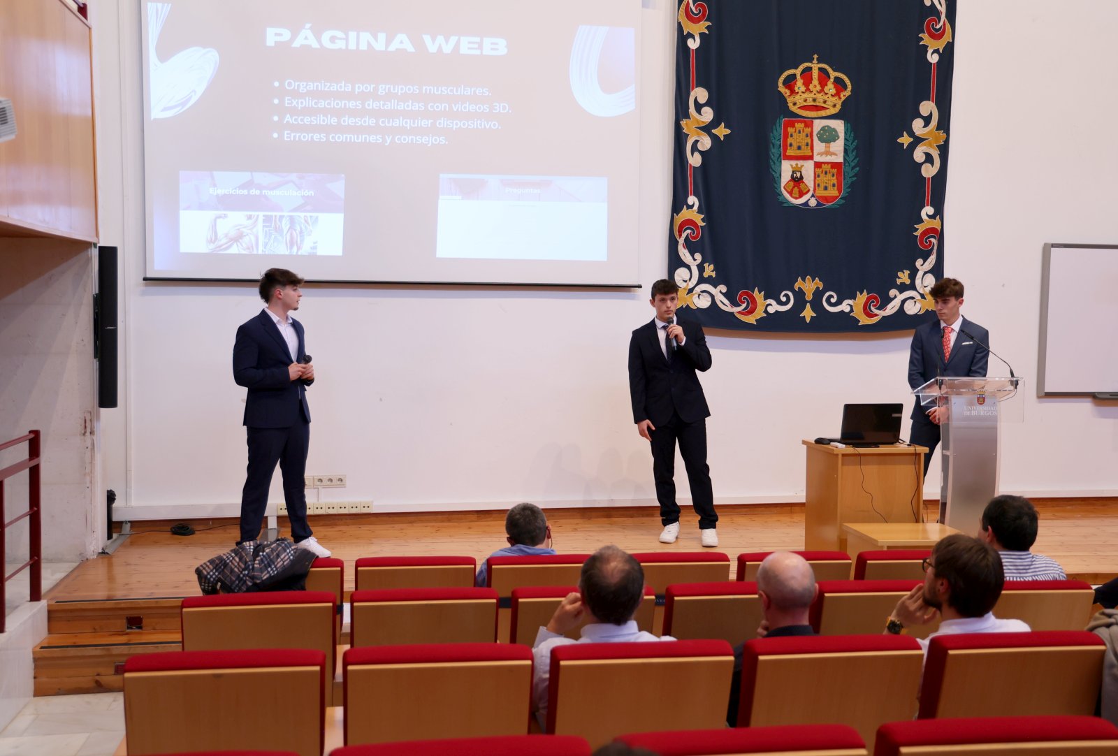 Los estudiantes Adrián Delgado Sánchez, Beltrán Gómez Hinojar y Lorenzo Maestre Marín presentaron “Proyectos centrados en la investigación de las Ciencias de la Actividad Física y del Deporte. Entrenador personal web”, en el que han diseñado una herramienta digital en forma de página web con el objetivo de reducir el riesgo de lesiones en la práctica deportiva, optimizar el rendimiento, democratizar el acceso a la información de calidad y fomentar hábitos saludables. La página, organizada por grupos musculares, muestra vídeos 3D sobre prácticas correctas de ejercicios, corrección de errores más comunes y consejos para mejorar la práctica deportiva.