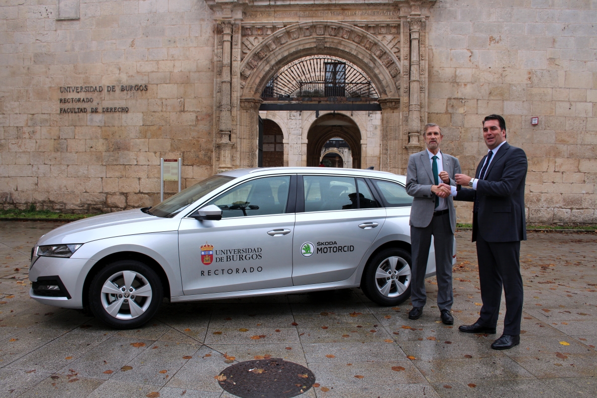 El rector de la Universidad de Burgos, Manuel Pérez Mateos, y el gerente de Motorcid Burgos S.L., Fernando Andrés García-Angulo, han renovado esta mañana un convenio para la cesión de un vehículo Skoda Octavia Kombi por parte del concesionario a la universidad.