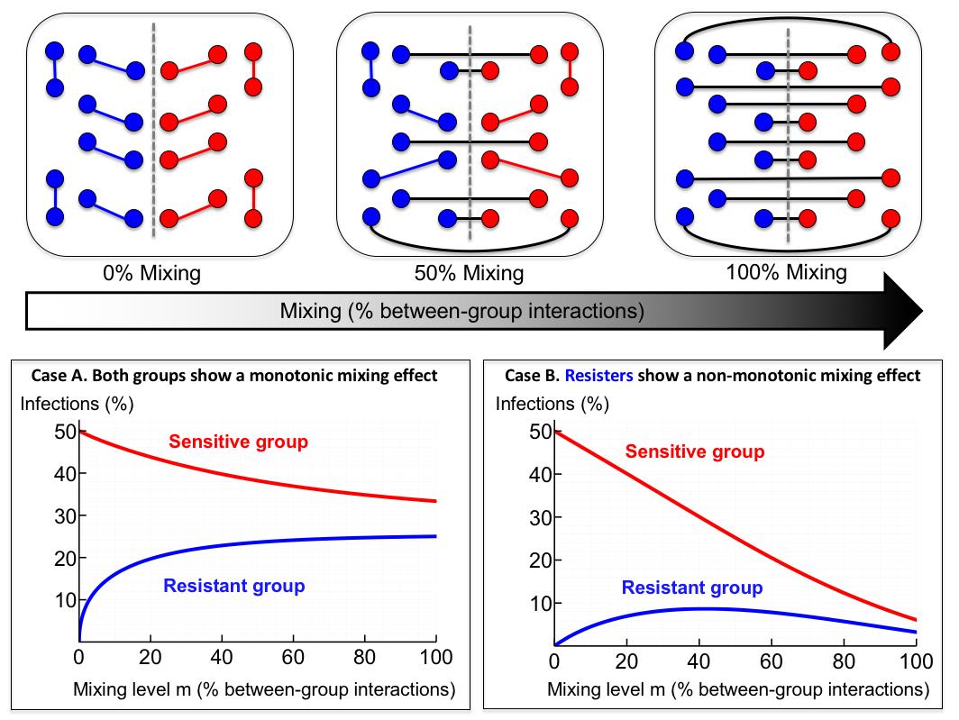 Este efecto paradójico se debe a la retroalimentación existente entre los dos grupos: desde una situación estable inicial correspondiente a un nivel de mezcla dado (por ejemplo, 60% de mezcla en el escenario correspondiente al caso B en la Fig. 1), aumentar el nivel de interacción entre los dos grupos puede ser inicialmente perjudicial para el grupo resistente, que comenzará a encontrarse con más personas infectadas. Sin embargo, esas mismas interacciones entre grupos provocarán una reducción en el nivel de infección del grupo sensible. En ocasiones, esta reducción puede llegar a ser tan significativa que el efecto total sobre el grupo resistente resulta positivo, una vez que los beneficios del efecto reductor inducido en el grupo sensible repercuten de vuelta sobre el grupo resistente. De esta forma, puede llegarse a un nuevo equilibrio (dinámicamente estable) en el que ambos grupos están mejor.