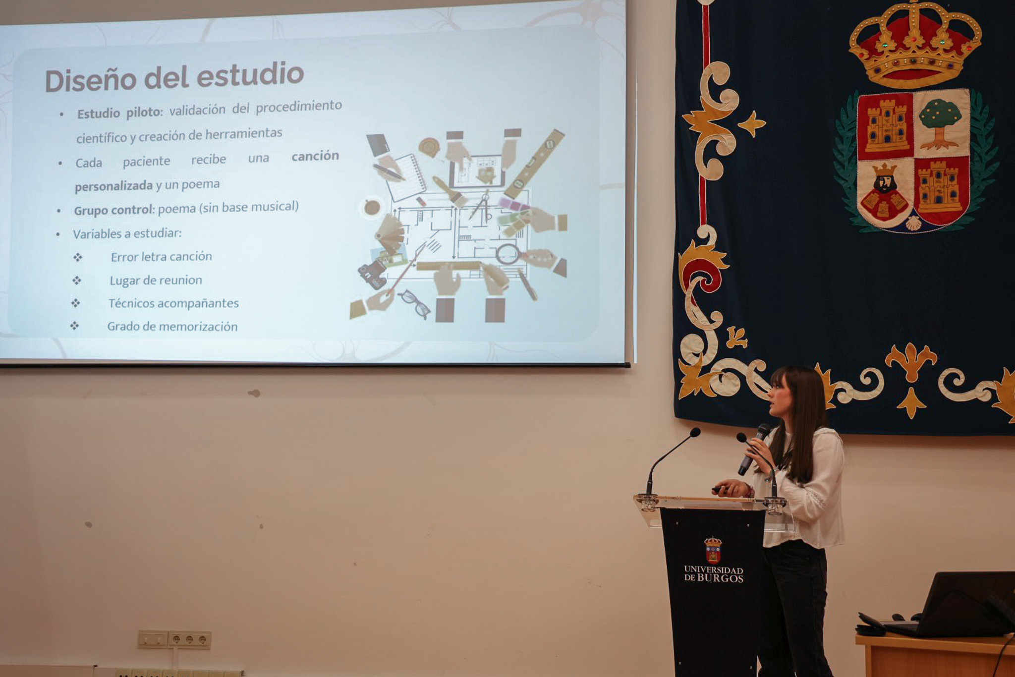 En su proyecto, la estudiante Vega Pérez Neila llevó a cabo un proyecto en el que exploró el uso de la música y la poesía como herramientas de estimulación cognitiva y emocional en enfermos de Alzheimer mediante el diseño de terapias personalizadas dirigidas a tres pacientes de AFABUR. Tras la recogida de datos biográficos relevantes de los participantes, y con apoyo de aplicaciones informáticas, creó canciones personalizadas, del estilo musical preferido de cada uno y que incorporaban elementos clave de la historia de cada paciente, incluyendo deliberadamente una pequeña inexactitud con el fin de estimular la memoria y provocar la reacción cognitiva. Como alternativa complementaria también se elaboró un poema recitado con el mismo propósito evocador. Las composiciones musicales fueron alojadas en YouTube, facilitando así su acceso y la repetición y la estimulación continuada de la memoria autobiográfica. Aunque no se obtuvieron resultados concluyentes, a causa del corto período de intervención -quince días- y del carácter progresivo de la enfermedad, sí se puso de manifiesto el potencial de la terapia musical como herramienta complementaria con una intervención no invasiva, sin efectos secundarios, de bajo coste y accesible, que además aporta un claro componente de acompañamiento emocional tanto al paciente como a su entorno.