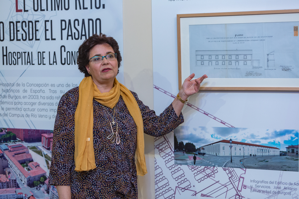 Zaparaín afirma que la exposición ha sido todo un reto. “Se nos planteó que fuese a través de paneles para luego poder trasladarlos a la biblioteca u otros lugar de la provincia. Había que crear un diseño atractivo con los paneles, con imágenes, pero también combinando imágenes antiguas con modernas. Hemos introducido algunos originales de los que estoy especialmente satisfecha”. En concreto, se refiere a 2 dibujos, dos trazas de dos edificios emblemáticos del Hospital del Rey y del Hospital de la Concepción del siglo XVII y XVIII; y la aportación de la maqueta que utilizó para la restauración el arquitecto Parte Arroyo que la comisaria vio en una fotocopia en blanco y negro en el proyecto de restauración y que buscó en el Ministerio... hasta que la localizó en el estudio de Parte Arroyo. El arquitecto también ha cedido a la UBU ocho planos para los fondos documentales de la Universidad de gran valor histórico.
