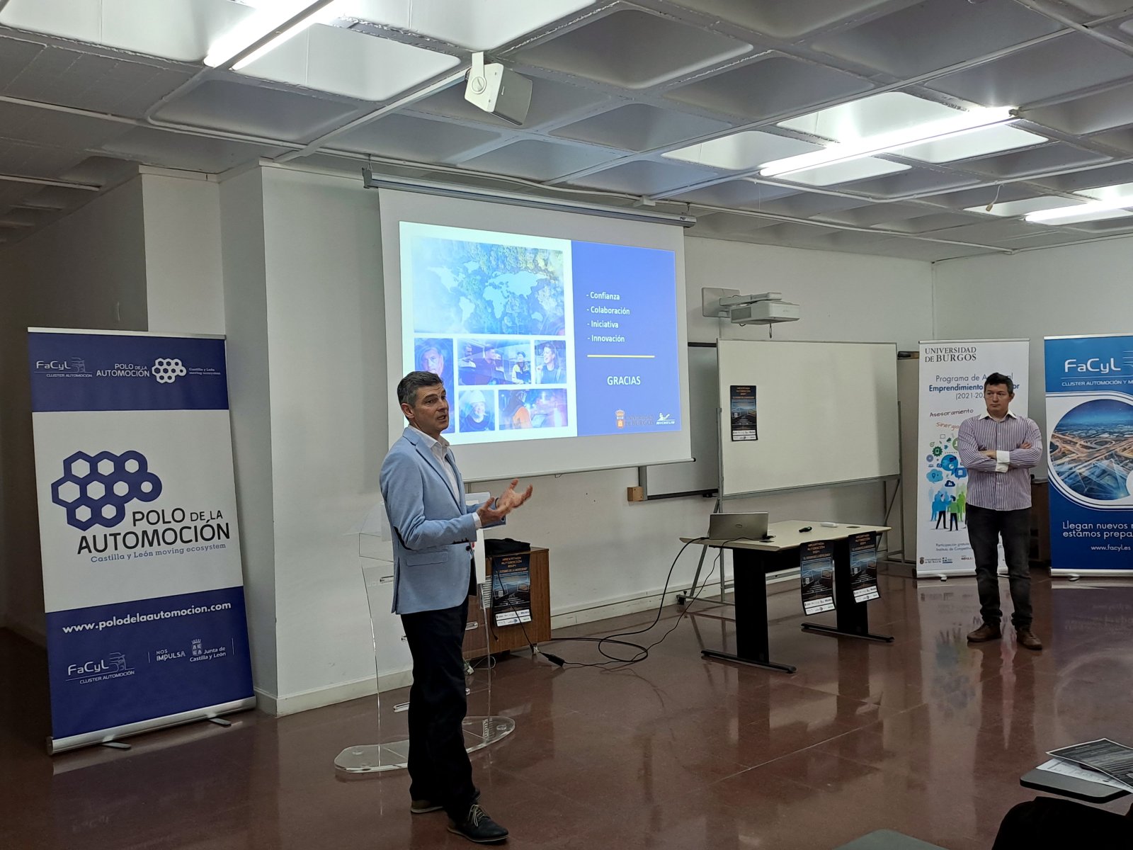 Para favorecer este conocimiento de la labor investigadora y posibilidades de transferencia, se presentó un caso de éxito en la relación universidad-empresa, bajo el lema "Uniendo caminos: Michelín y UBU en colaboración" a cargo de Miguel Ruano (Coordinador del Laboratorio de Innovación en MICHELIN Aranda) y Jesús Enrique Sierra (Profesor titular UBU en área de Ingeniería de Sistemas y Automática y miembro del grupo de investigación ARCO).