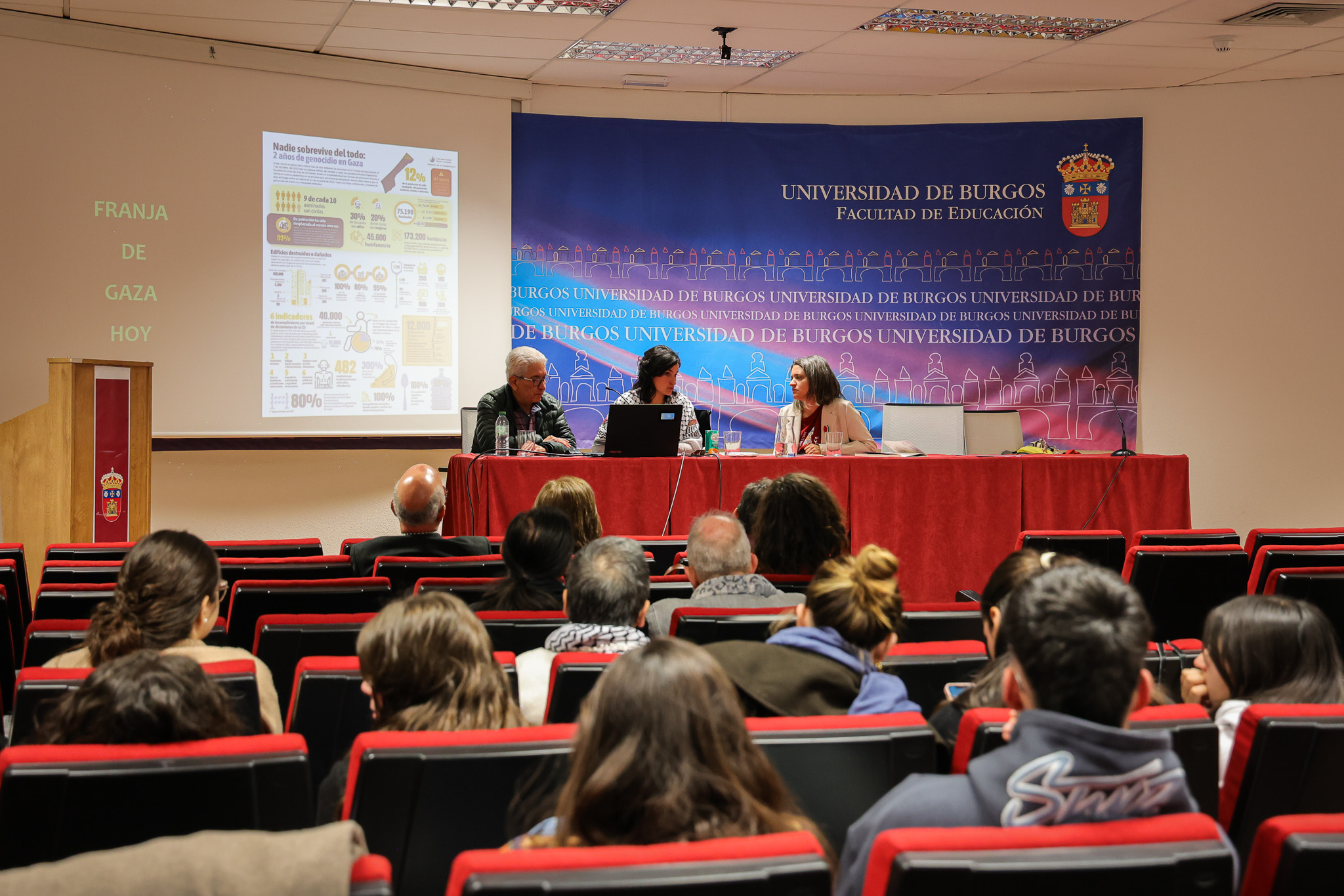 Poner palabras a la barbarie y a la crueldad de la guerra es un ejercicio que en muchas ocasiones se antoja prácticamente imposible, pero es lo que trataron de hacer ayer un médico gazatí, residente en Burgos y que prefiere no dar su nombre, y su hija, graduada en Educación Social en la Universidad de Burgos. En una actividad organizada por el grupo Educación por Palestina, conformado por docentes de la UBU integrados en la Red Universitaria por Palestina, varios estudiantes de la Facultad de Educación pudieron escuchar cómo está viviendo durante estos dos últimos años la familia de estas dos personas, que aún permanece en Gaza. “Lo que nos cuentan es una angustia y un dolor insoportable. Sin alimentos, sin casa, porque ya no tienen casa y viven en una tienda de campaña. Antes tenían una vida cómoda y ahora viven como mendigos”, explican.
