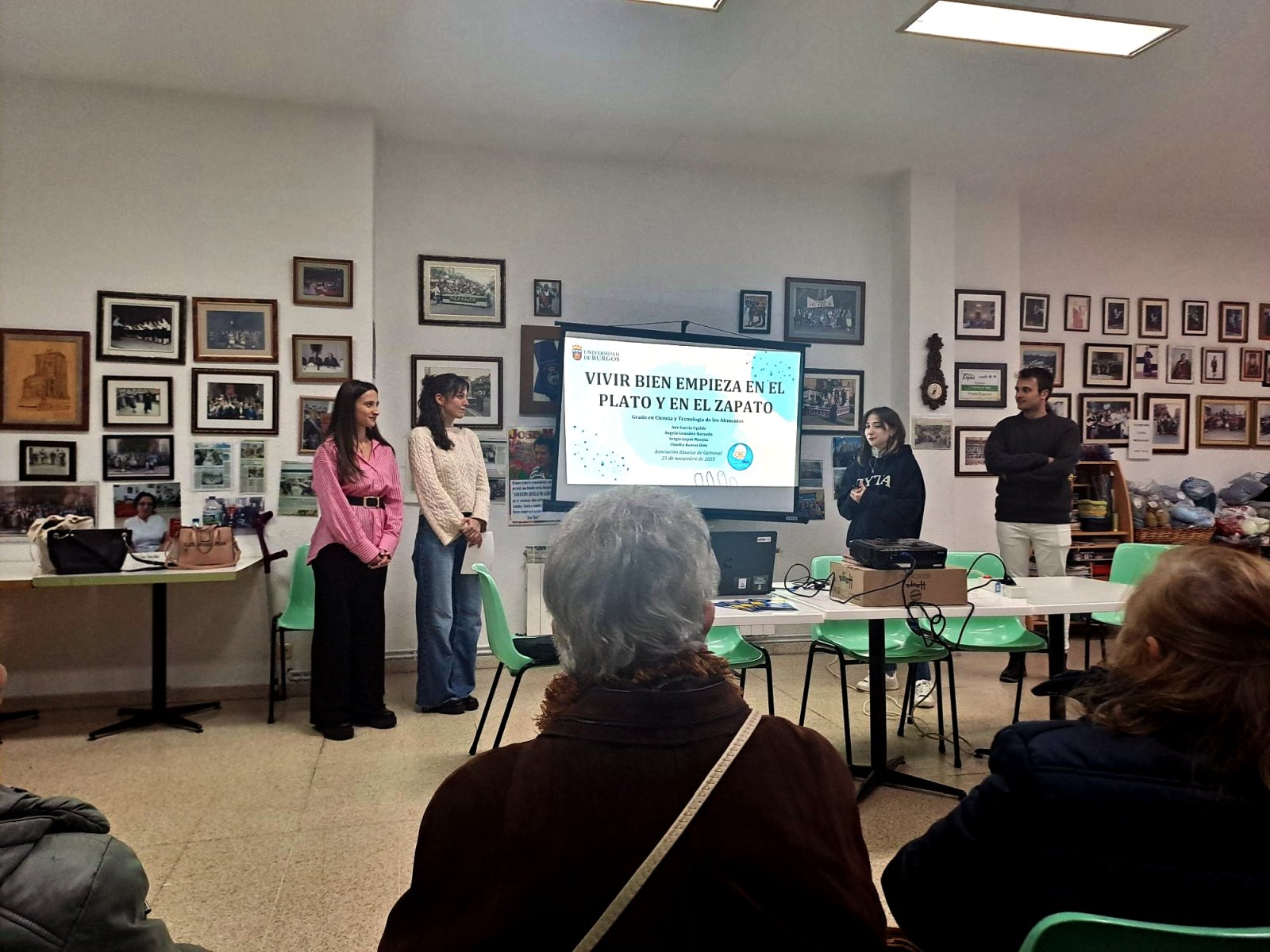 Con motivo de la Semana Cultural de la Asociación “Abuelas de Gamonal”, el 25 de noviembre, cuatro estudiantes y graduados del grado en Ciencia y Tecnología de los Alimentos, tutorizados por la profesora Sara Alonso de la Torre, del Área de Nutrición y Bromatología (Departamento de Biotecnología y Ciencia de los Alimentos) impartieron una charla sobre alimentación saludable para mayores de 65 años,“Vivir bien empieza en plato y el zapato”, en la sede de la asociación. La actividad se desarrolló en colaboración con el Programa de Acercamiento Intergeneracional.