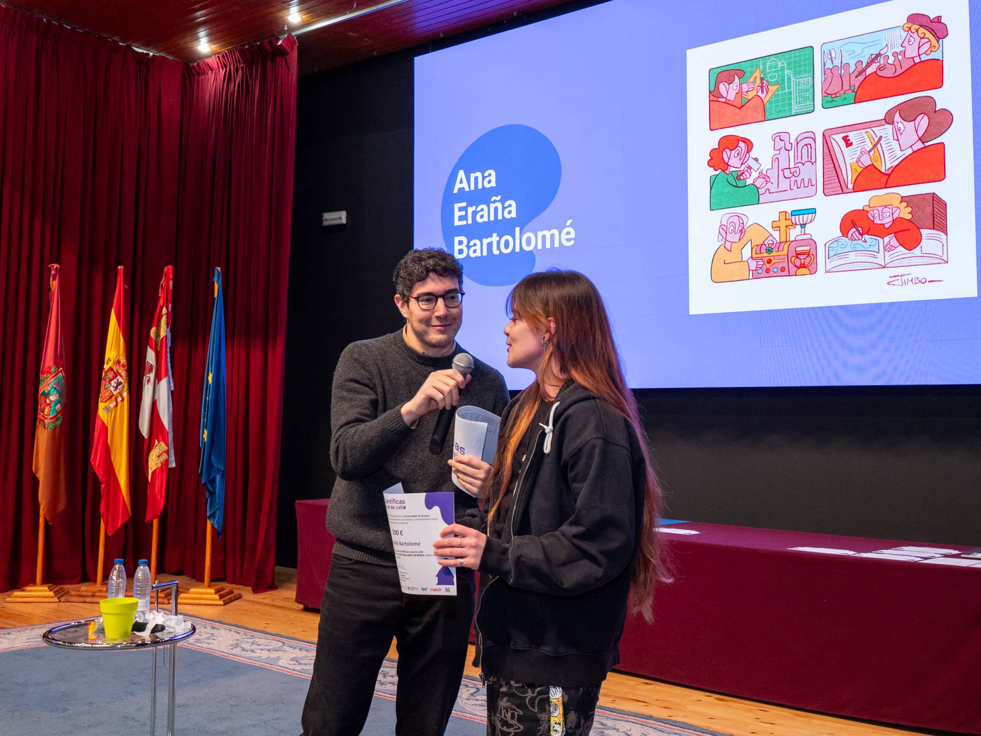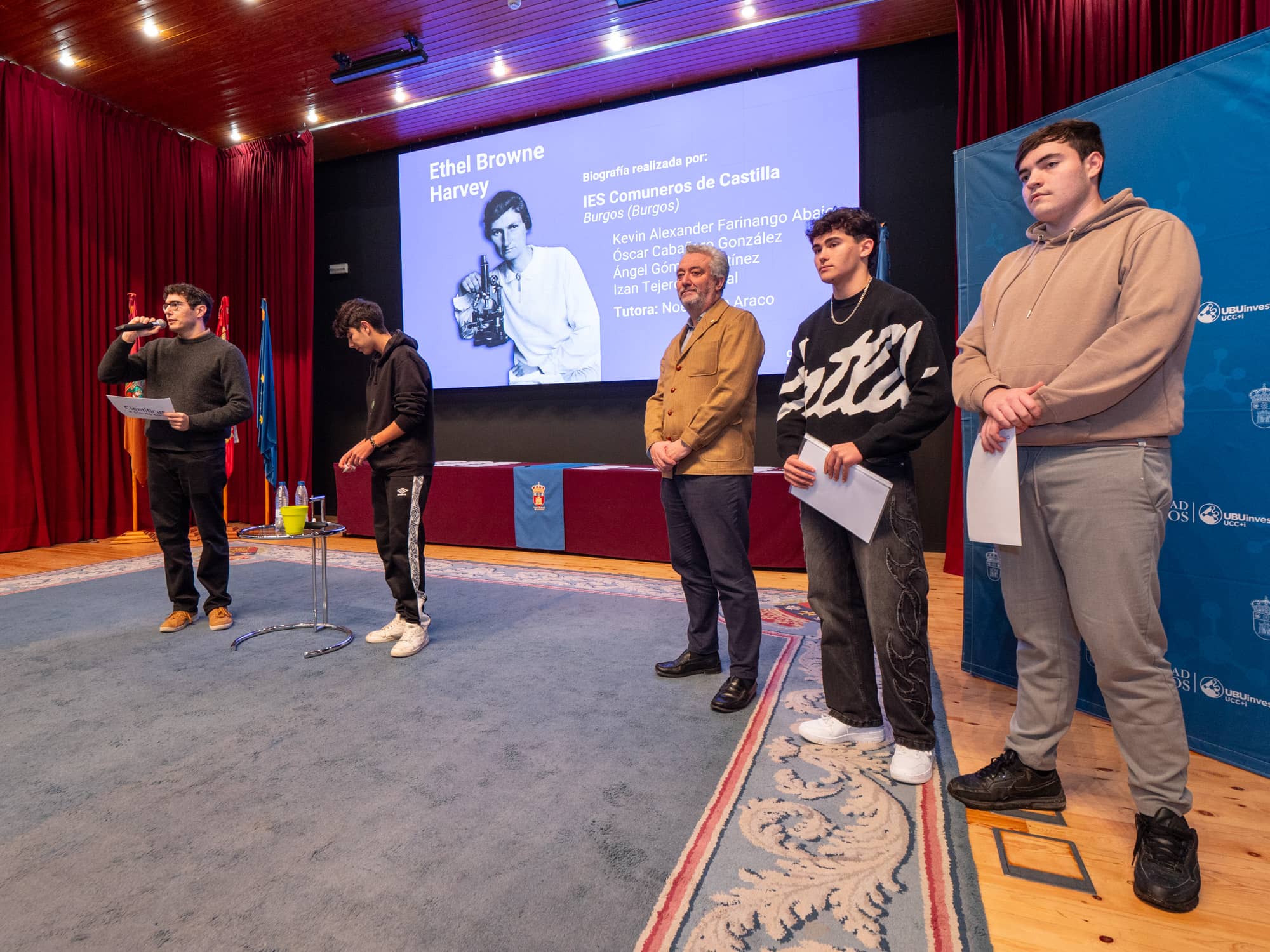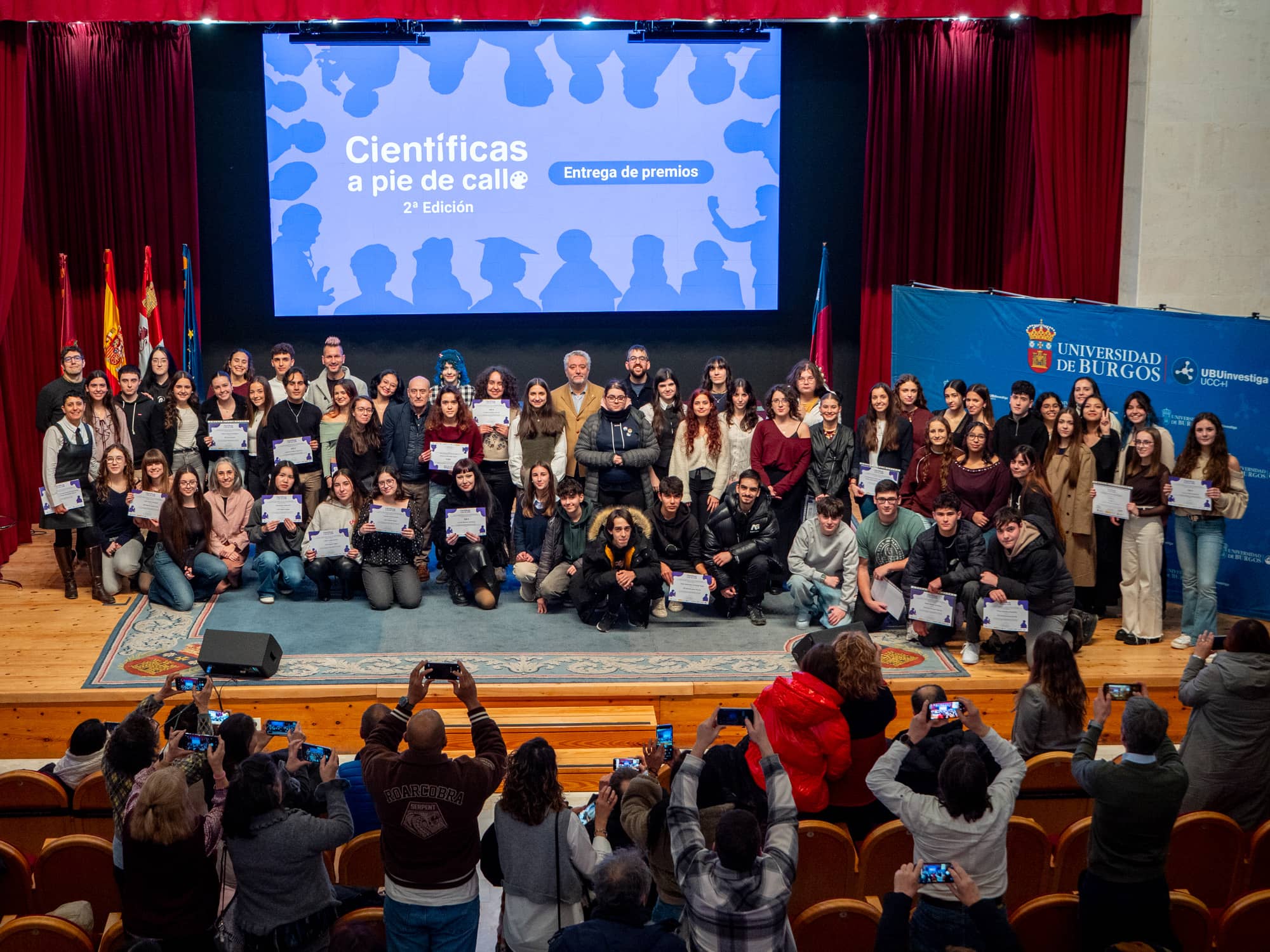 Centros educativos y jóvenes artistas se pusieron ayer en contacto en la entrega de premios de “Científicas a pie de calle”, celebrada en el Paraninfo de la Universidad de Burgos para anunciar a los equipos escolares y artistas ganadores de esta segunda edición. El proyecto ha entregado 40 premios correspondientes a dos concursos: 20 premios de 150€ en material para los grupos escolares y otros 20 de 200€ para los jóvenes artistas.