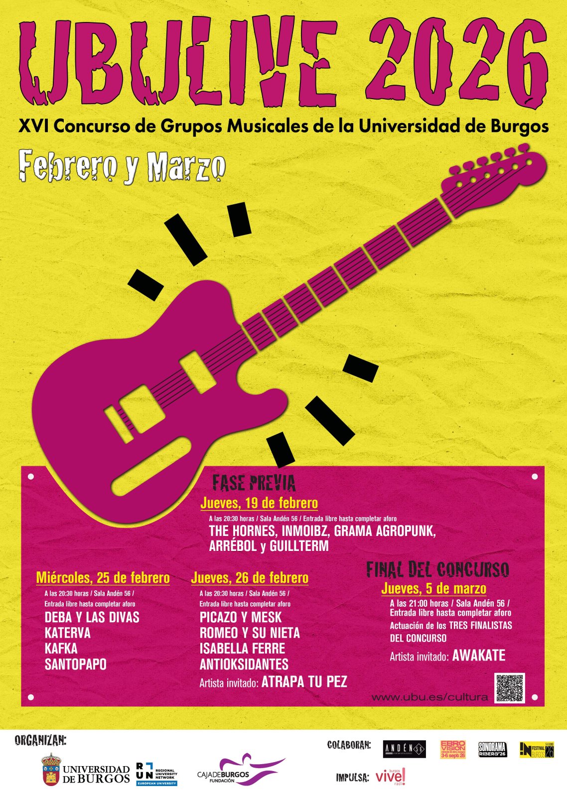 Los conciertos de la fase previa de la XVI edición del festival UBULIVE comenzarán el jueves 19 de febrero con las actuaciones de The Hornes, Inmoibz, Grama Agropunk, Arrébol y Guillterm. El miércoles 25 de febrero será el turno de Deba y las Divas, Katerva, Kafka y Santopapo, y el jueves 26 de Picazo y Mesk, Romeo y su Nieta, Isabella Ferre y Los Antioksidantes, con Atrapa tu Pez como artista invitado. En total, trece grupos emergentes de géneros muy variados, con pop, rock, indie, electrónica y punk.