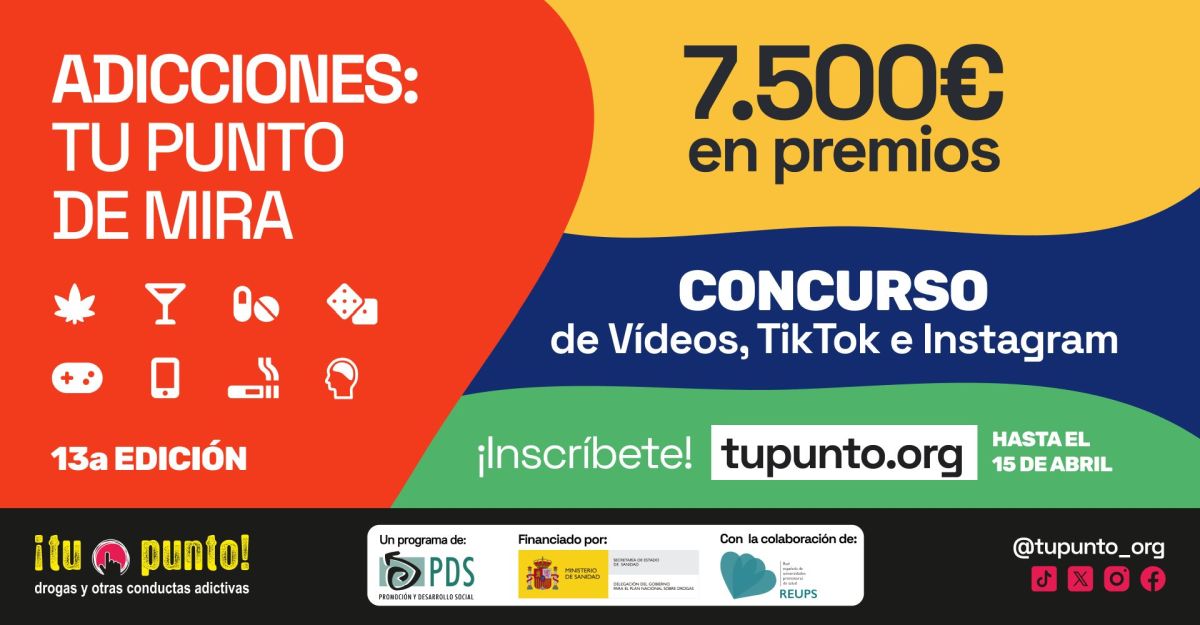 La Asociacin PDS – Promocin y Desarrollo Social en el marco del Programa “Tu Punto” de prevencin de riesgos derivados del consumo de drogas y otras conductas adictivas entre estudiantes universitarios, financiado por la Delegacin del Gobierno para el Plan Nacional sobre drogas, y la Universidad de Burgos como miembro de la REUPS (Red espaola de Universidades Promotoras de Salud ) anuncian las nuevas ediciones de los Concursos "Adicciones: tu punto de mira" 2024.