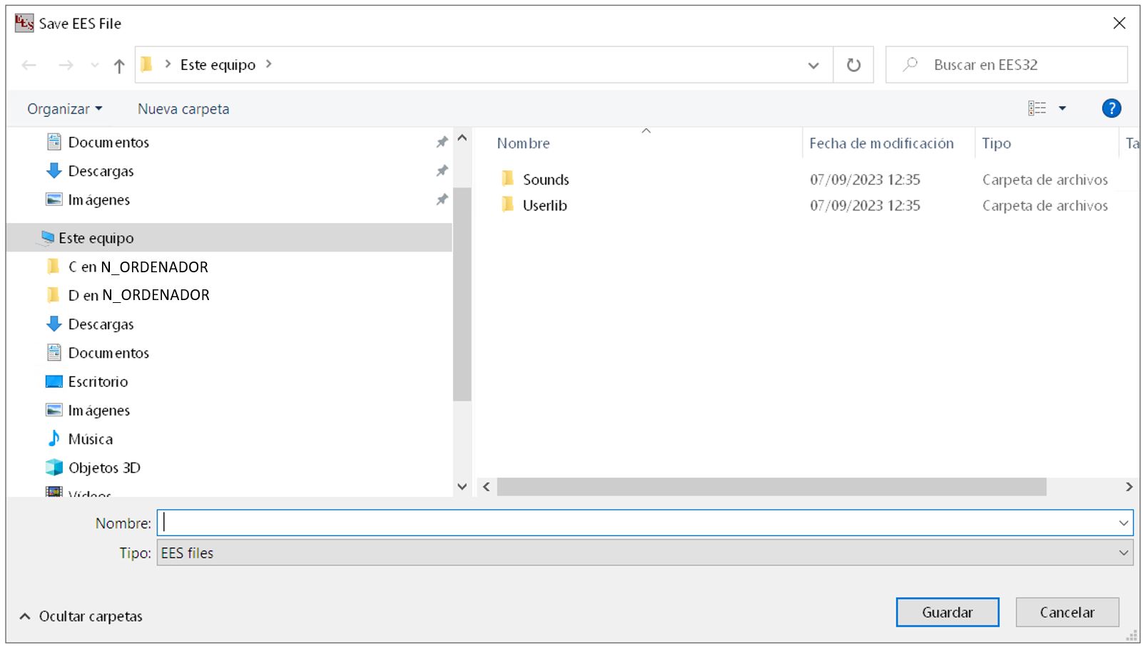 Para evitar perdidas de información es importante guardar los ficheros generados desde la aplicación en tu equipo. La información almacenada en el servidor se borra periódicamente. Guarda la información en las unidades de almacenamiento de tu ordenador. En la figura que acompaña a este texto, se muestra un cuadro de diálogo con las unidades C y D en un ordenador que se llama N_ORDENADOR. En tu caso las letras de unidad dependerá del numero de discos y/o unidades USB conectadas y el nombre que se muestra a continuación de las letras de unidad es el de tu ordenador. Si lo que quieres es abrir un archivo en tu ordenador debes proceder de la misma forma. |