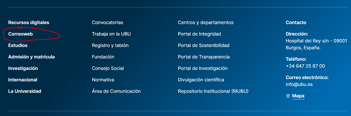 Puedes acceder desde la página principal de la UBU, pinchando en el apartado Estudiantes, subapartado Correoweb: