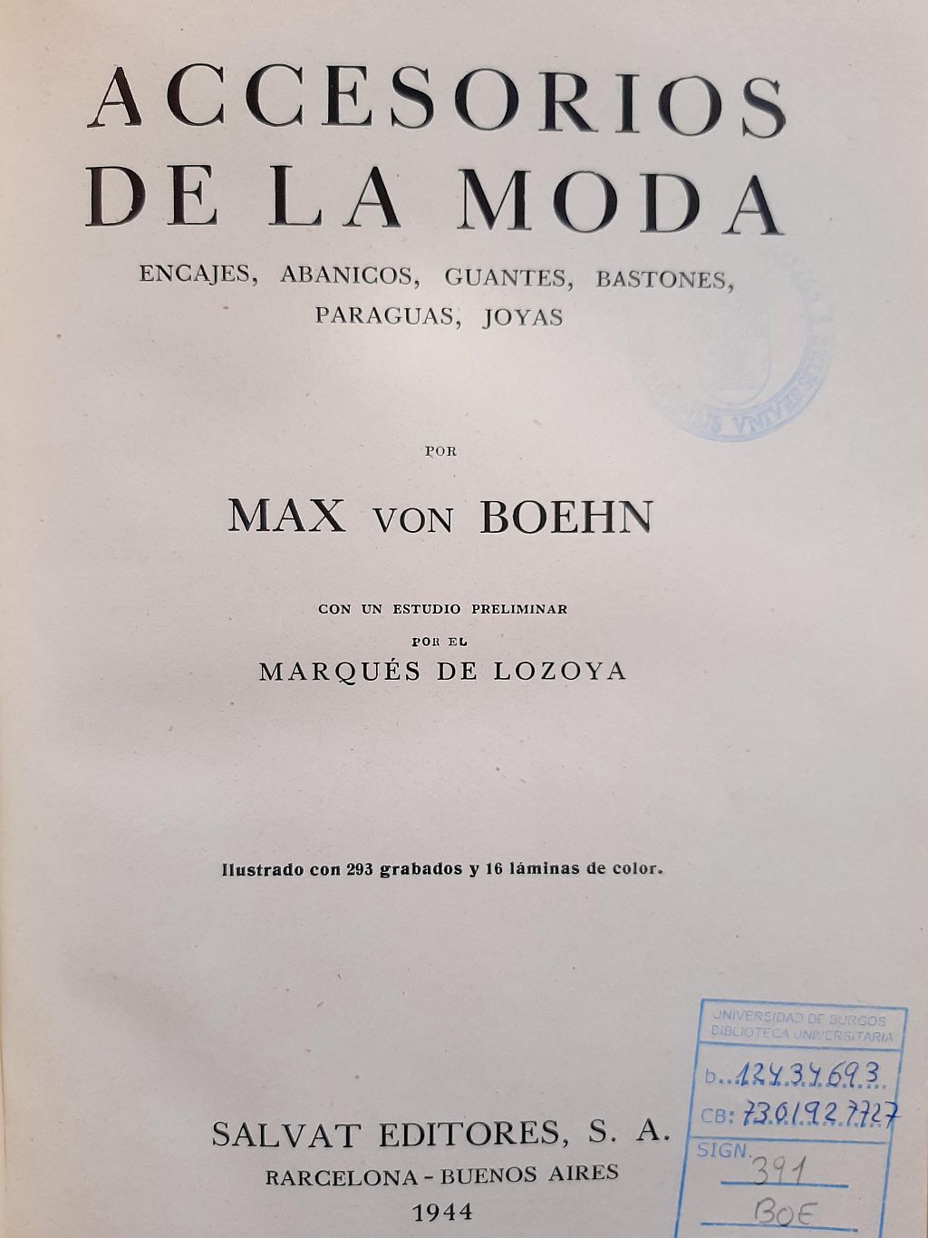 Boehn, Max von, and Juan Contreras y López de Ayala Lozoya. Accesorios de la moda : encajes, abanicos, guantes, bastones, paraguas, joyas. Salvat, 1944