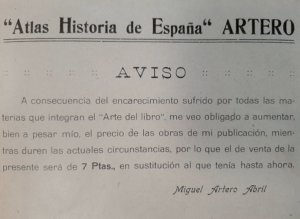 - Aviso de incremento de precio de venta de la obra, con explicación de los motivos del mismo, firmado por Miguel Artero Abril. Según su expediente académico en el Instituto Provincial de Segunda Enseñanza Alfonso X El Sabio de Murcia, natural de Granada, cursa estudios de Bachiller entre 1908 y 1914.