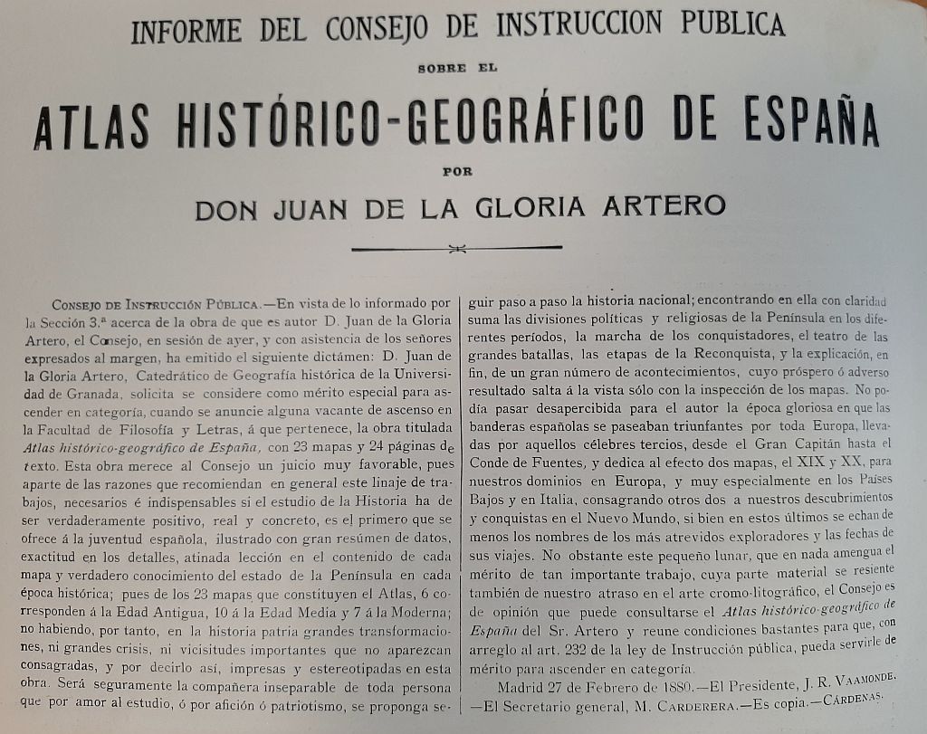 Esta obra tiene además un valor añadido, la inclusión del Dictamen del Consejo de Instrucción Pública de 27 de febrero de 1880, según el cual, el Atlas histórico-geográfico de España, se considera obra única en su clase, y calificada con condiciones bastantes para que, con arreglo al artículo 232 de la Ley de Instrucción pública, pueda servir de mérito para ascender en Categoría, cuando se anuncie alguna vacante de ascenso en la Facultad de Filosofía y Letras.